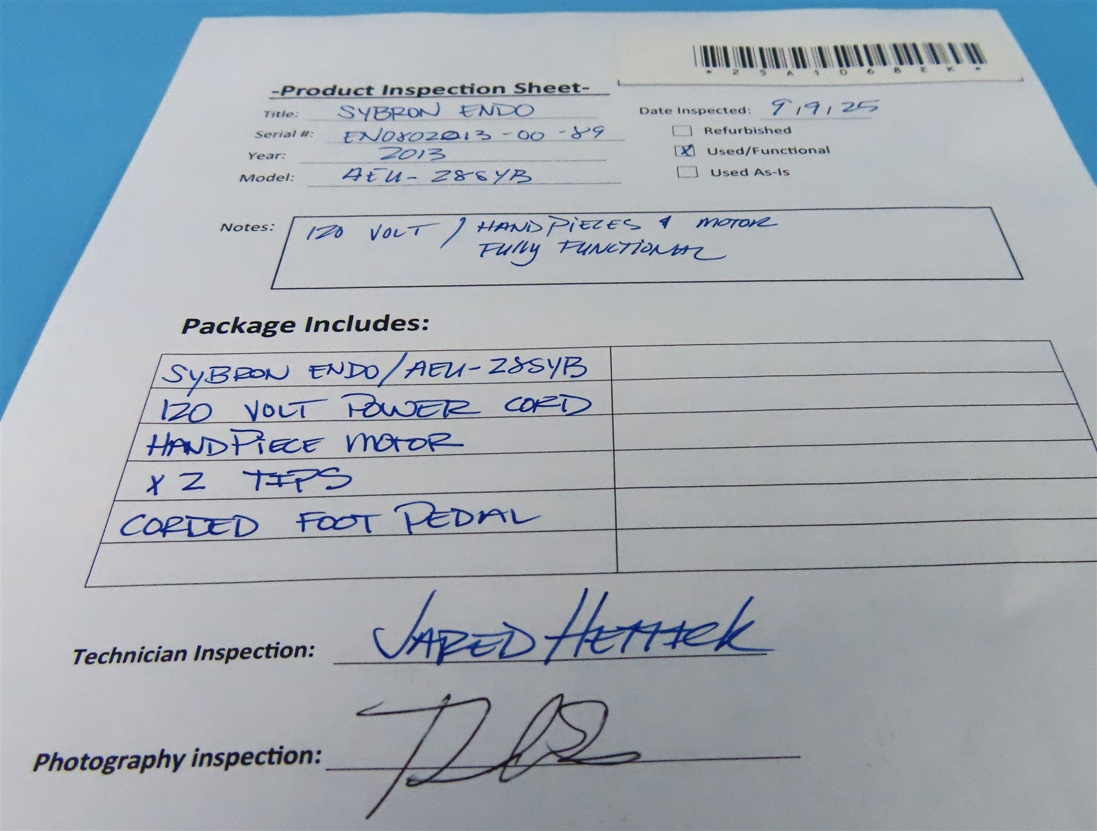 Your purchase will NOT include:This product is pre-owned and may not include the same accessories as a new, unused unit. - other accessories not shown or listed here.SybronEndo AEU-28SYB- I Plug in the unit and power on. Confirm LCD screen activates with no pixel faults. I looked for the SybronEndo logo and preset menu. Attach the handpiece and contra-angle. Tested High and Low RPM. Inspection Result: - Ready for Resale.