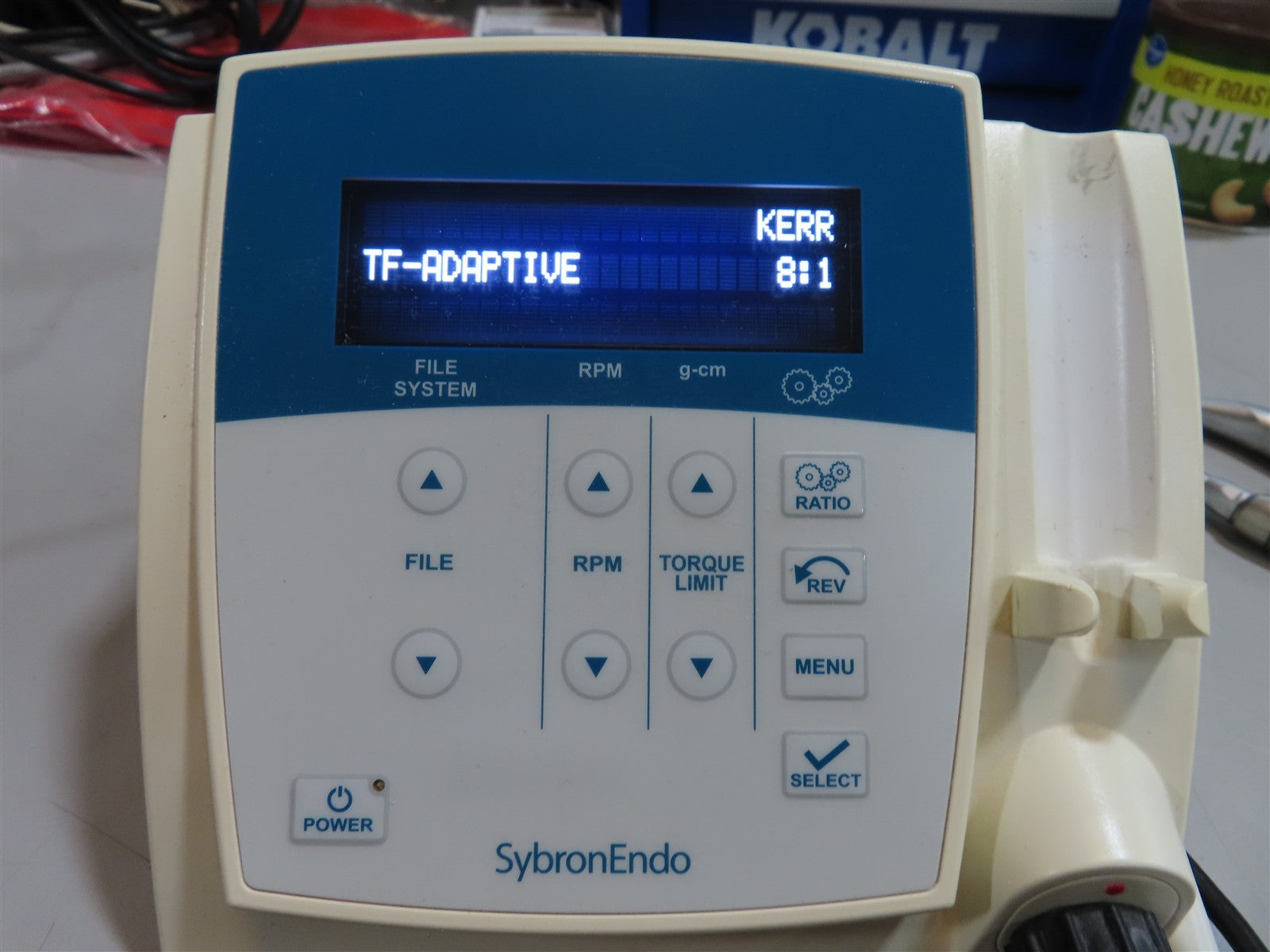 SybronEndo AEU-28SYB- I Plug in the unit and power on. Confirm LCD screen activates with no pixel faults. I looked for the SybronEndo logo and preset menu. Attach the handpiece and contra-angle. Tested High and Low RPM. Inspection Result: - Ready for Resale.