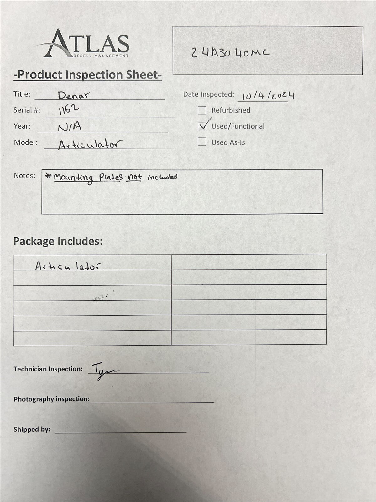 Your purchase will NOT include:Mounting plates FacebowThis product is pre-owned and may not include the same accessories as a new, unused unit. - other accessories not shown or listed here.This articulator is fully functional but does not include mounting plates.