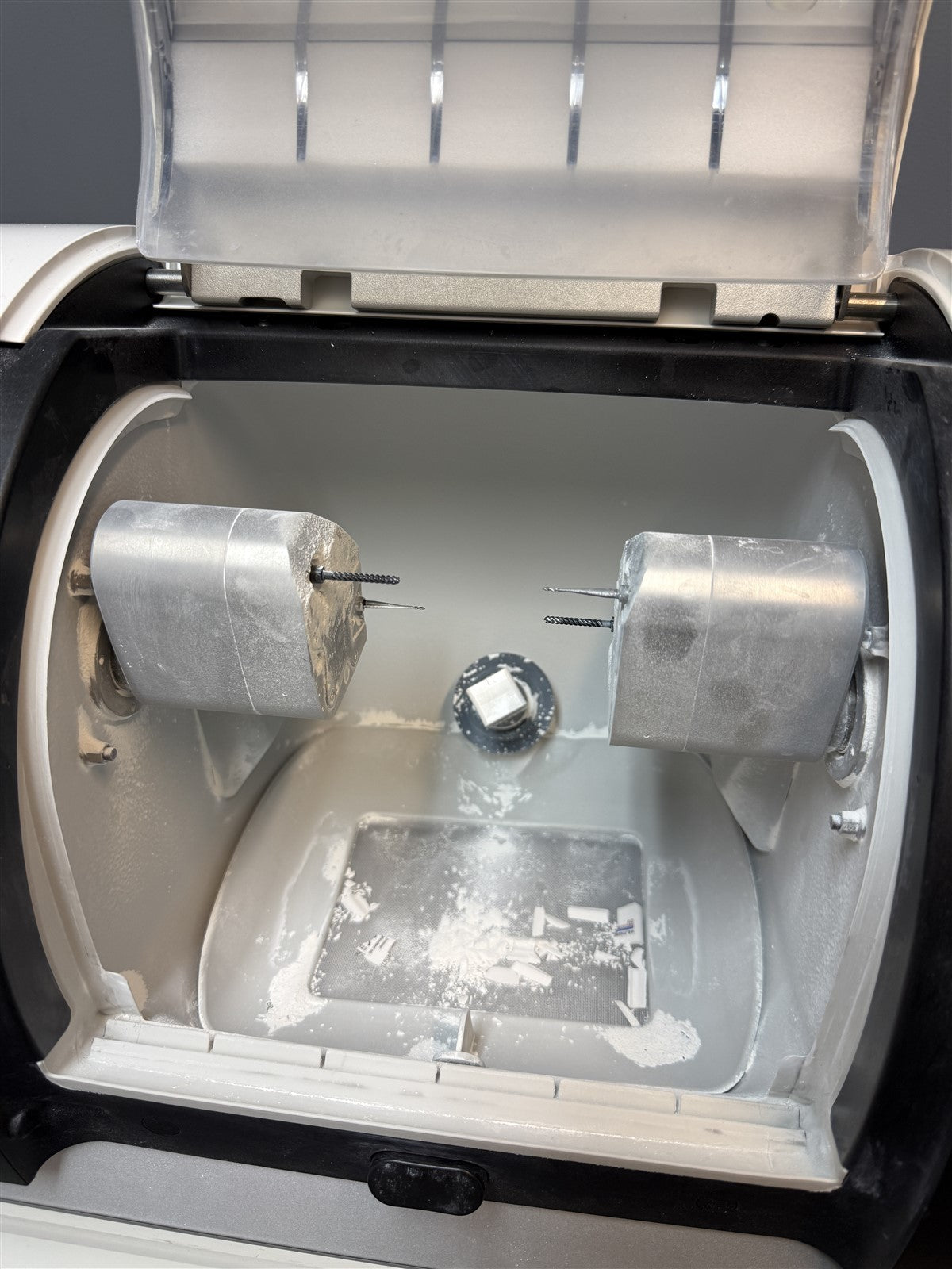 Primemill, dust collectoy, calibration tool, and accessories shown in photos