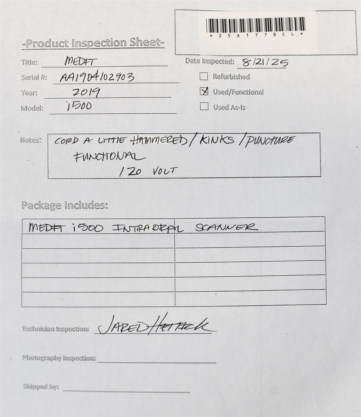 Atlas Resell Management has more experience testing and shipping CEREC and other CAD/CAM units than anyone else on eBay. Just check out the wide selection of CAD/CAM units in our store.We're proud to be the most trusted source for quality used CAD/CAM units in the pre-owned dental equipment market. Your purchase will NOT include:Power supply.This product is pre-owned and may not include the same accessories as a new, unused unit. - other accessories not shown or listed here. Medit i500 Intraoral Scanner High-speed scanning at ~35 frames per second Accurate scanning: up to 21 µm ± 1.48 µm (high precision) Dual-camera system with LED imaging for HD full-color capture Triangulation technology for reliable 3D imaging with minimal moving parts Powderless operation for enhanced patient comfort Ergonomic, lightweight design (~280 g) with small tip for easy intraoral access Single-button control for intuitive scan start-stop functions Open architecture: exports STL, OBJ, and PLY formats; seamless Medit Link integration Removable & autoclavable tips—cross-infection control (up to ~50 cycles) No subscription fees; cost-effective entry-level solutionMedit i500 Intra Oral Scanner was powered on (USB) , Blue light came on. Fan is running. Inspection Result: - Ready for Resale.