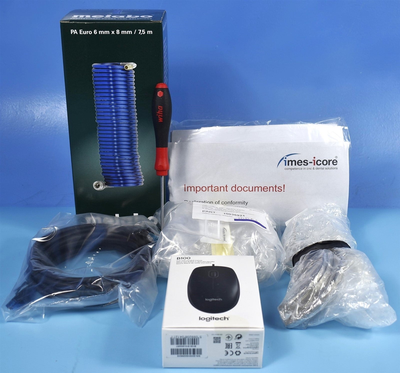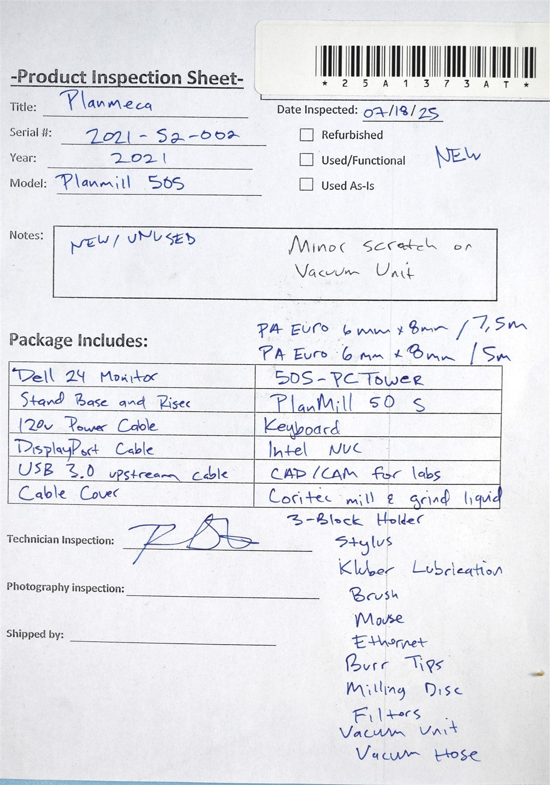 Dell 24 Monitor, Stand Base and Riser, 120V Power Cables, Displayport Cable, USB 3.0 Upstream Cable, Cable Cover, PA EURO 6mm x 8mm /7,5m, PA EURO 6mm x 8mm /5m, 50S-PCTower, PlanMill 50 S, Keyboard, CAD/CAM for labs, Coritec Mill & Grind Liquid, 3-Block Holder x2, Stylus, Kluber Lubrication, Brush, Mouse, Ethernet, Various Burr Tips, Milling Discs, Filters, Vacuum Unit, Vacuum Hose