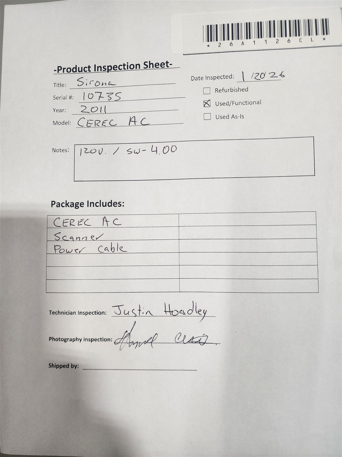 Atlas Resell Management has more experience testing and shipping CEREC and other CAD/CAM units than anyone else on eBay. Just check out the wide selection of CAD/CAM units in our store.We're proud to be the most trusted source for quality used CAD/CAM units in the pre-owned dental equipment market. Your purchase will NOT include:ManualThis product is pre-owned and may not include the same accessories as a new, unused unit. - other accessories not shown or listed here.The unit was powered on and initialized without issue. The display underwent a visual inspection, confirming proper illumination and clarity. All interface controls—including the panel buttons and mouse—were tested and responded appropriately. The scanner was activated and a test scan was performed, producing a clean and accurate result. Overall, the system demonstrated full operational functionality.