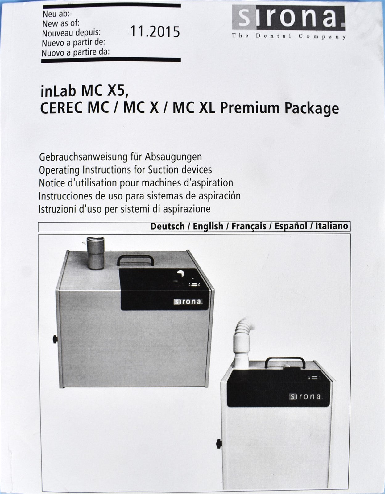 Sirona MC X5, 120 volt power cord. Dust collector and connections. Water Jug and line, INLab X5 Instructions.