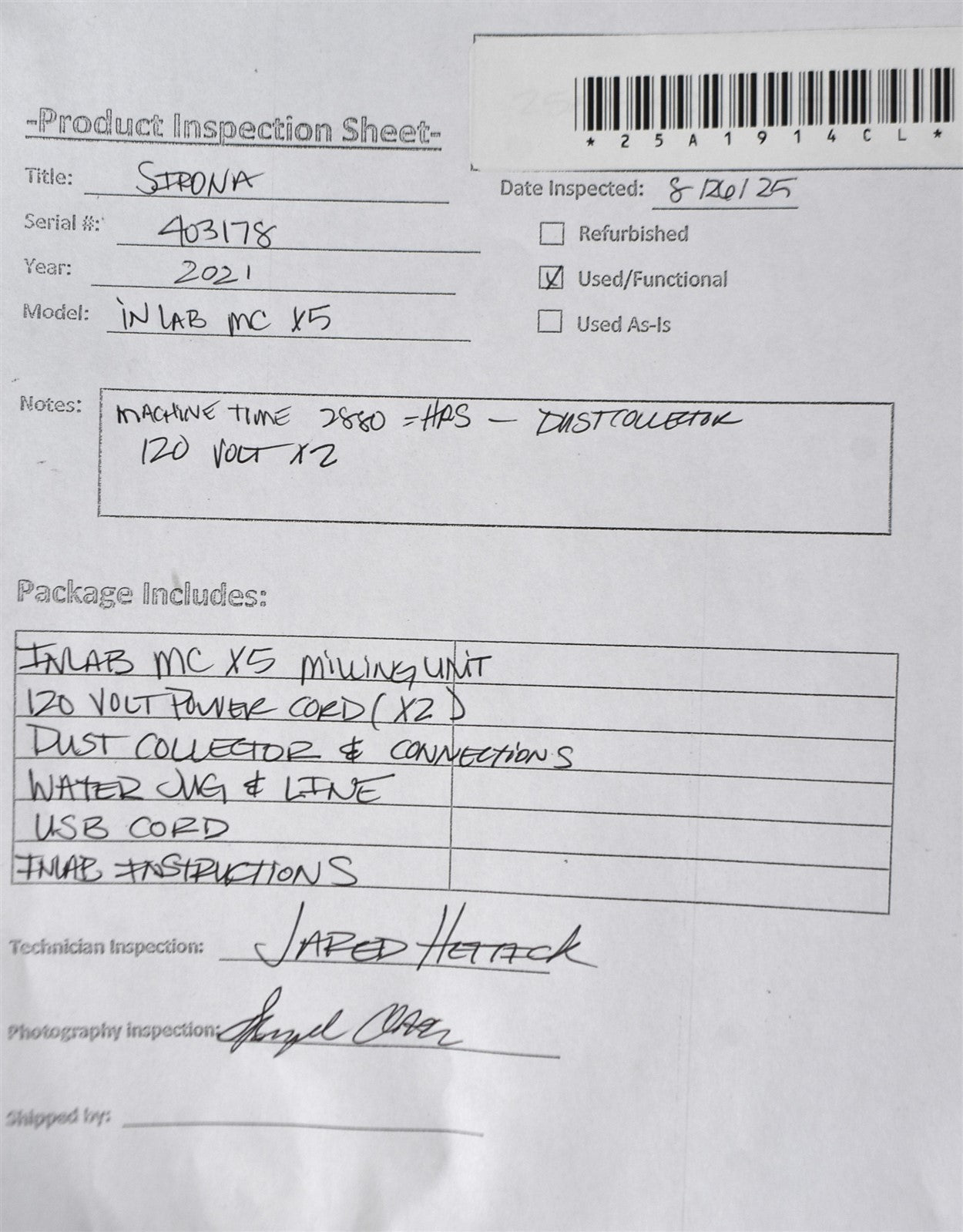 Power on Unit. (120 volt.) INLab X5 milling was tested to ensure full movements, stepper test; PASS. Dust collector ran and had suction. The unit has been cleaned and disinfected. Inspection Result: - Ready for Resale.