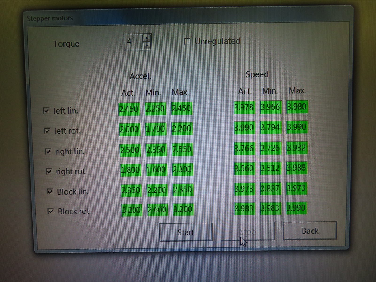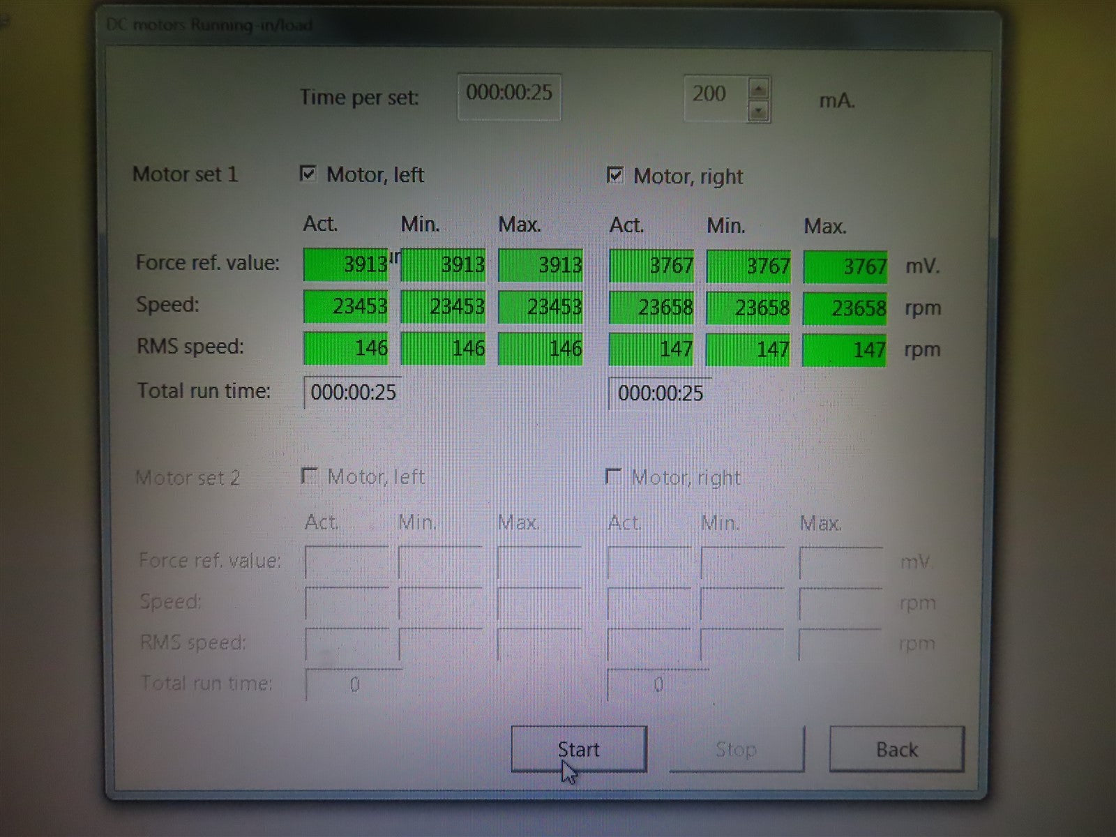 The unit was powered on and successfully updated to the latest software version. Following the update, it completed a full cleaning cycle and was subsequently calibrated. The system then underwent a comprehensive series of diagnostic evaluations, including the force sensor/stiffness assessment, load test, and motor stepper test. All tests passed without issue, confirming that the unit is fully operational.