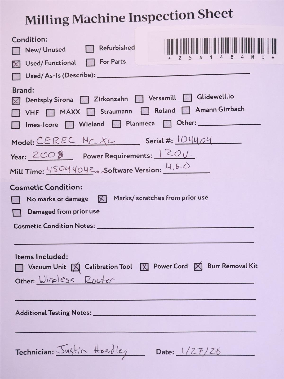 We're proud to be the most trusted source for quality used CAD/CAM units in the pre-owned dental equipment market. Your purchase will NOT include:This product is pre-owned and may not include the same accessories as a new, unused unit. - other accessories not shown or listed here.The unit was powered on and successfully updated to the latest software version. Following the update, it completed a full cleaning cycle and was subsequently calibrated. The system then underwent a comprehensive series of diagnostic evaluations, including the force sensor/stiffness assessment, load test, and motor stepper test. All tests passed without issue, confirming that the unit is fully operational.