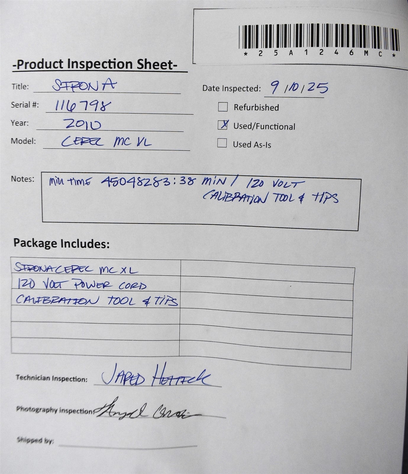 Sirona CEREC MC XL milling unit Was inspected for damage and defects, . Powered on unit for functional test. Ran STEPPER test: MOVING test Calibration tested .Mouse and keyboard connected,all lights and buttons were fully functional.120volt. Inspection Result: - Ready for Resale.