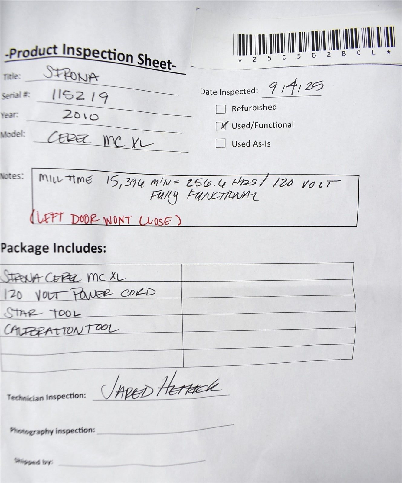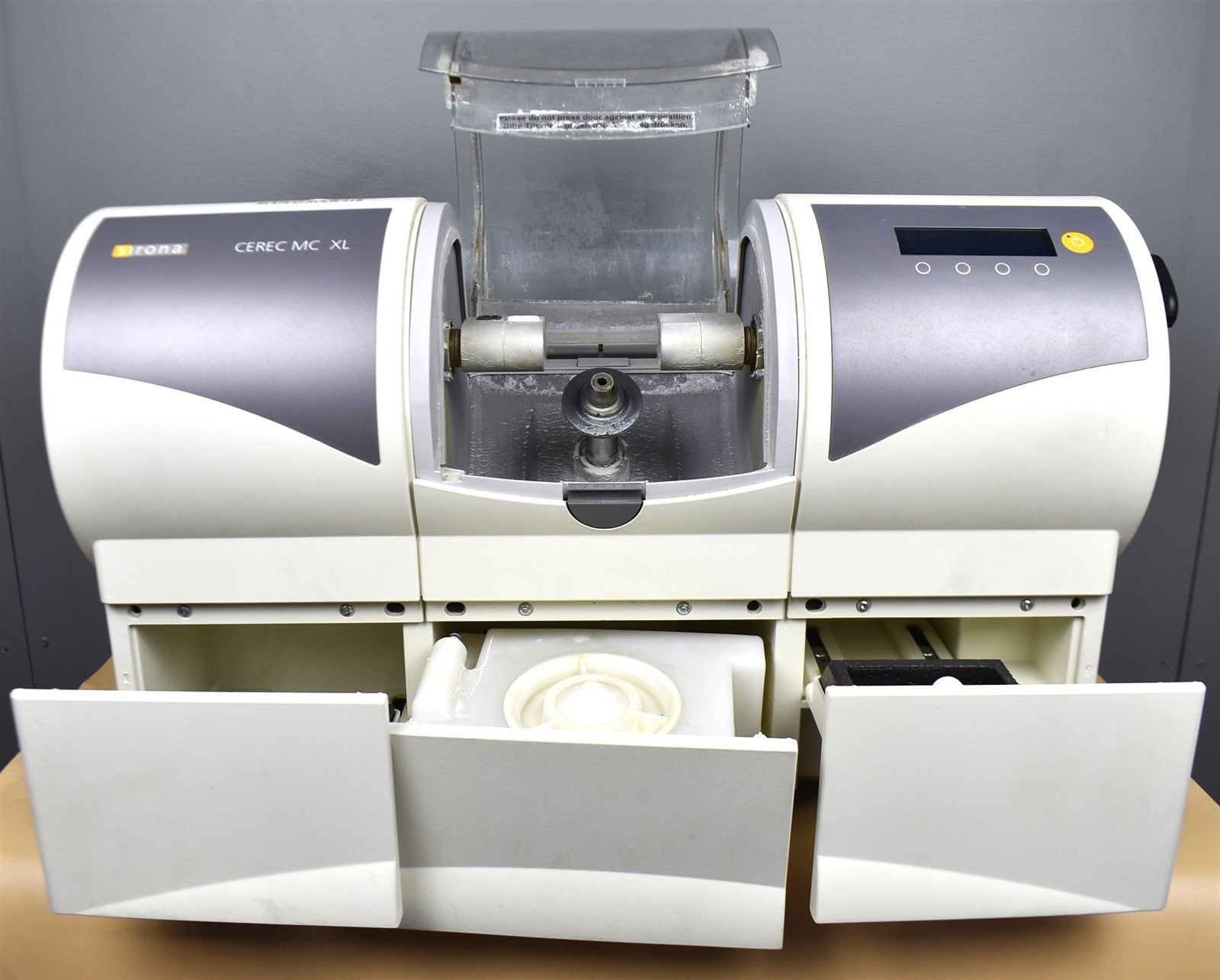 Sirona CEREC MC XL milling unit Was inspected for damage and defects, . Powered on unit for functional test. Ran STEPPER test: MOVING test Calibration tested .Mouse and keyboard connected,all lights and buttons were fully functional.120volt. Inspection Result: - Ready for Resale.