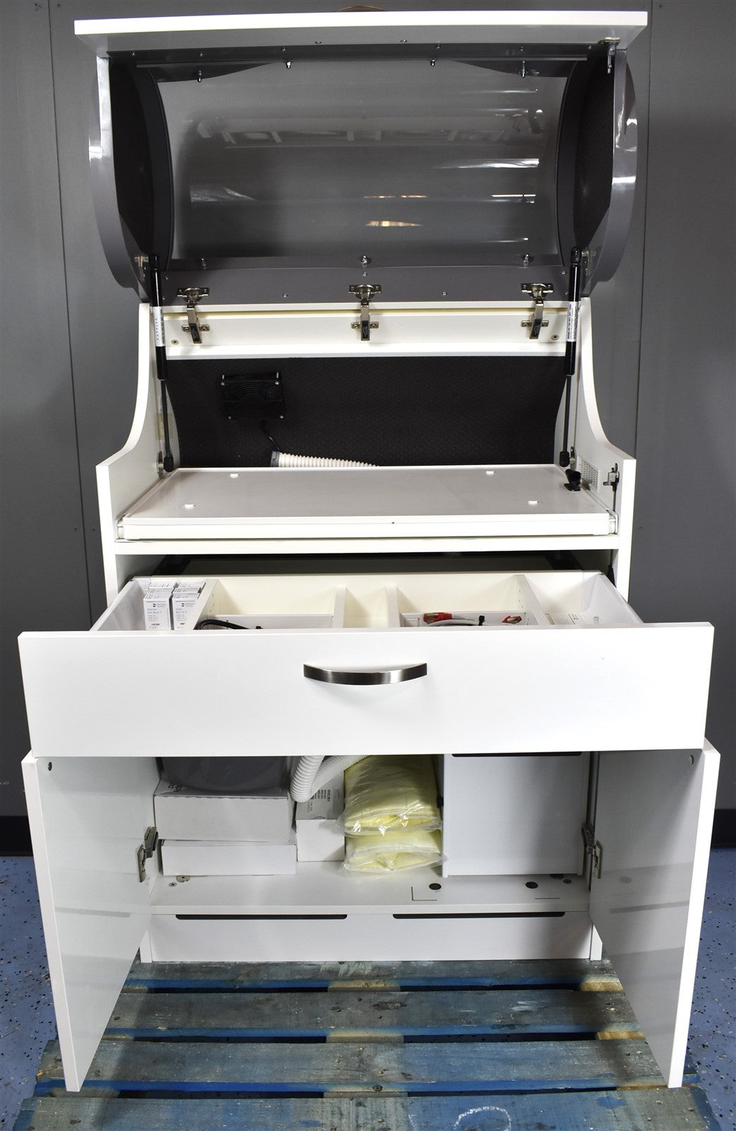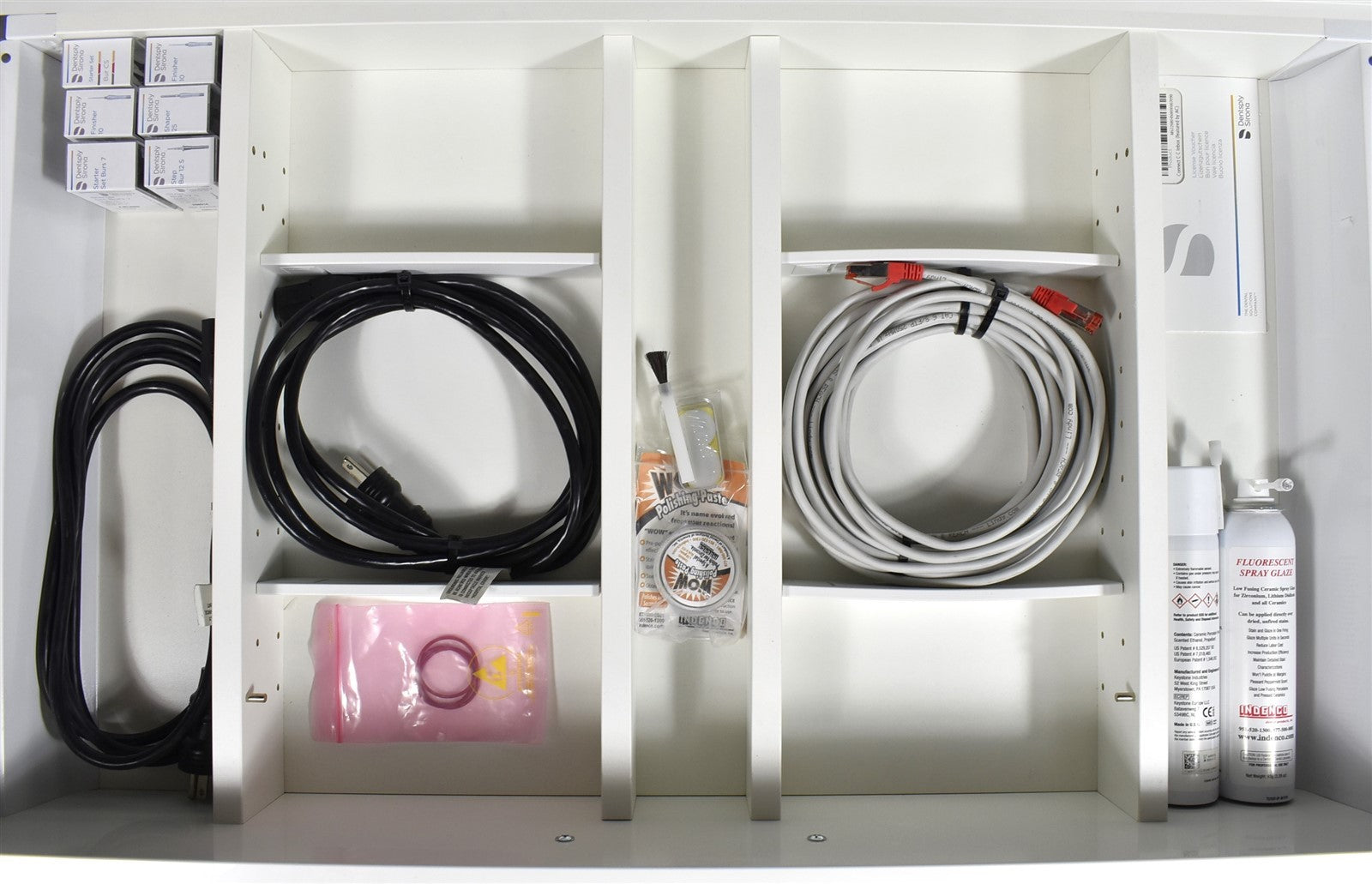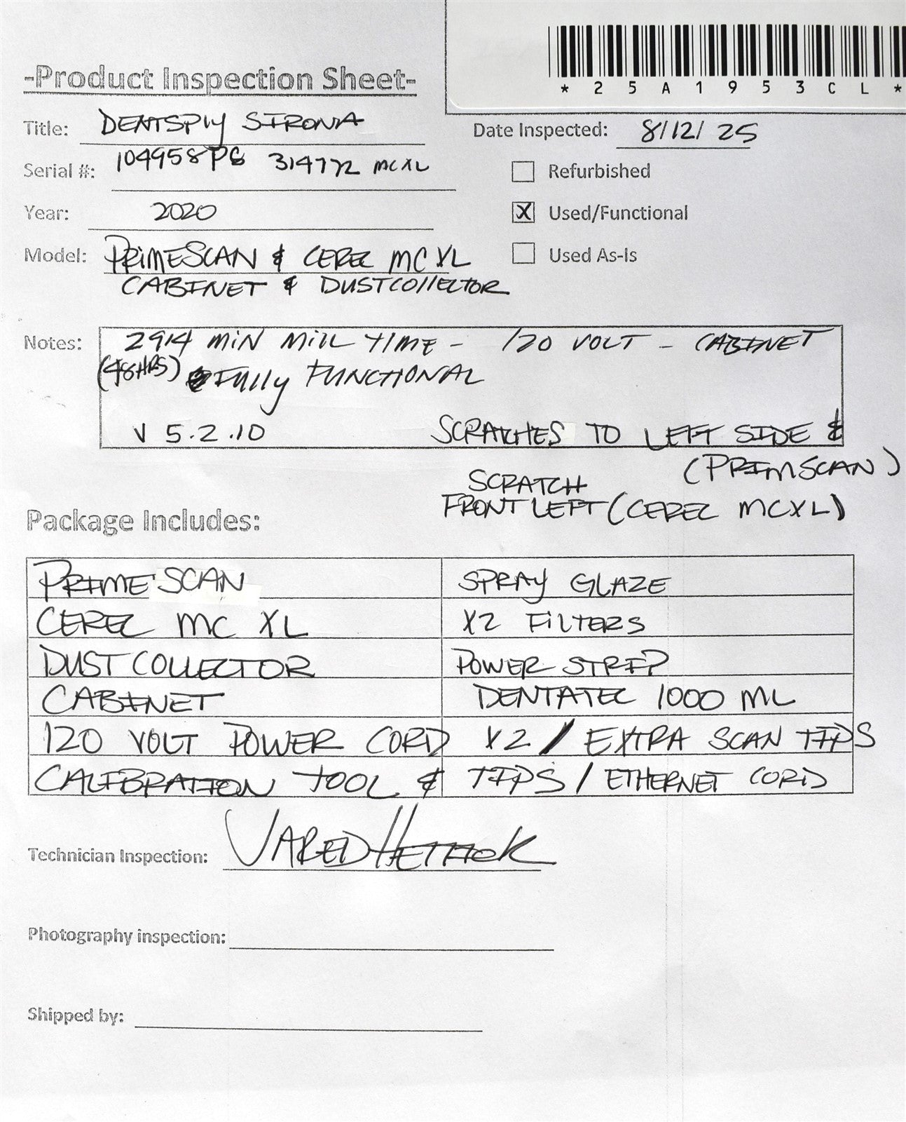PrimeScan, Cerec MC XL, Dust collector, Cabinet, 120 volt power cord x2, Calibration tool and tips, Spray Glaze, x2 Filters , Power strip, Dentatec 1000ml. Extra Scan tips.