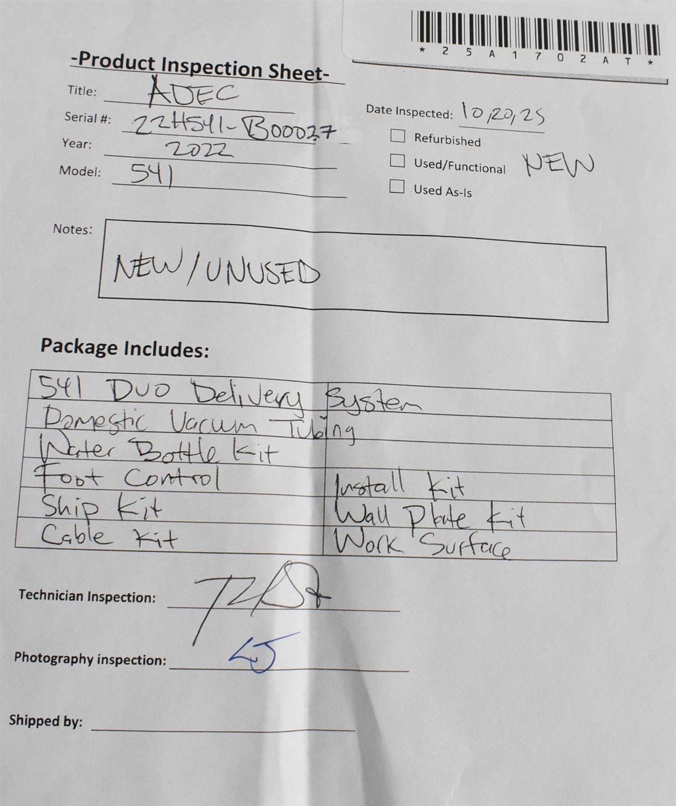 541 Duo Delivery System, Domestic Vacuum Tubing, Water Bottle Kit, Foot Control, Ship Kit, Cable Kit, Install Kit, Wall Plate Kit, Work Surface