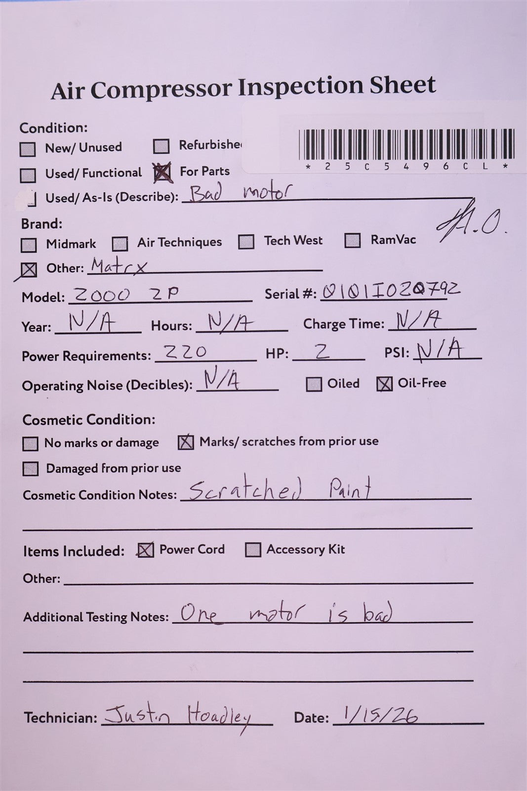 Your purchase will NOT include: - other accessories not shown or listed here.The unit was powered on and inspected. The air tank maintains pressure without any detectable leaks. However, one of the compressor motors operates roughly, suggesting a possible internal mechanical issue, such as a bent piston rod.