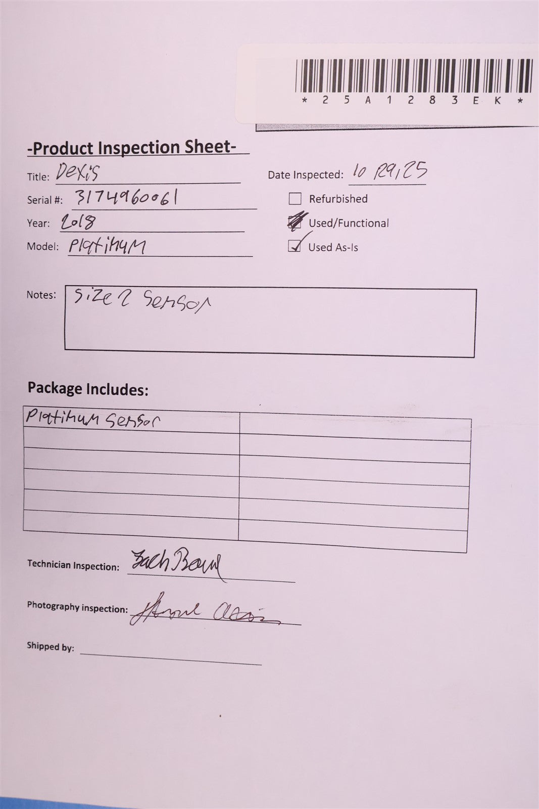 This item has undergone a thorough visual inspection and functional testing to check for any and all defects. The unit is a size 2 sensor and has been confirmed to be in conditions where it will possibly work right with correct calibration files, but our issues is not having those calibration files which is causing lines through final image.