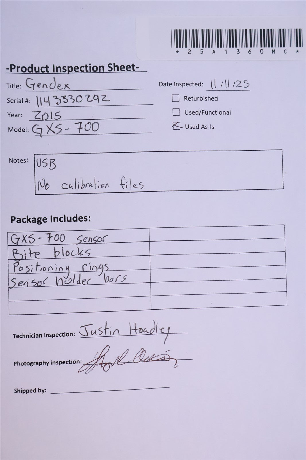 Your purchase will NOT include:Software - other accessories not shown or listed here.The Gendex GXS-700 sensor was tested without factory-provided calibration files. Custom calibration files were generated to enable image acquisition; however, the resulting image exhibited linear artifacts, suggesting potential issues with sensor calibration accuracy or internal hardware integrity. Sensor Size 2