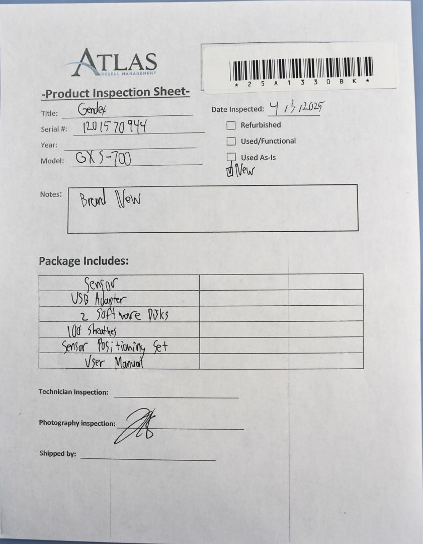 Your purchase will NOT include:N/A - other accessories not shown or listed here.The Gendex GXS-700 SIZE 1 SENSOR KIT is brand new, so it was inspected for damage or missing parts. Inspection Result: Passed - Ready for Resale • Advanced CMOS sensor technology enhances image quality. • Captures high resolution images; providing more than 20 visible line pairs per millimeter. • Capabilities of a wide range of x-ray exposure settings to provides consistent image quality and consistent results • Rounded corners and smooth edge on the sensor for a comfortable fit. • Durable materials and components increase the life span of the product. • Direct USB Connectivity to computer. No docking stations or adapters required. • Lightweight and portable with hi-speed USB 2.0 connectivity for quick and easy use over multiple operatories. • An “Always Ready” feature that automatically recognizes radiation and starts image acquisition without the need to initiate through software.