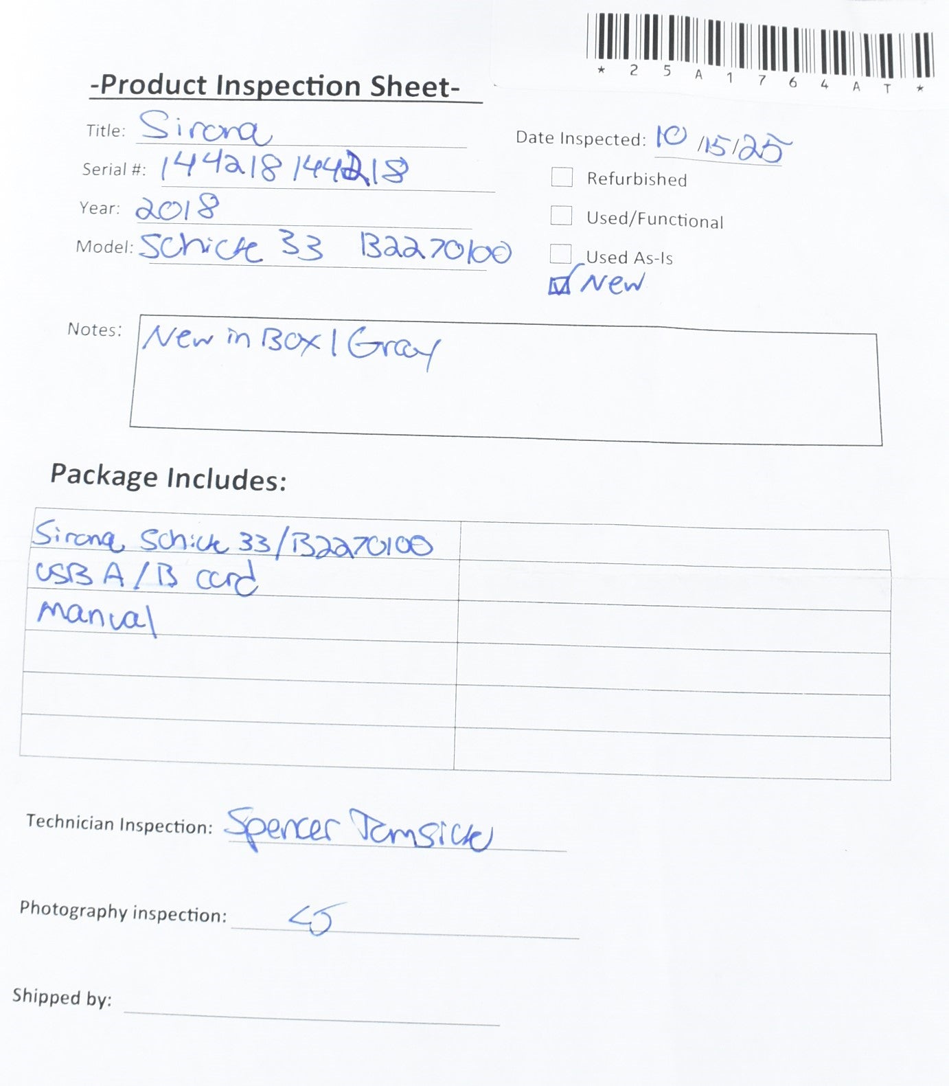 Verified that all components are present, undamaged, and document condition without powering on the unit.
