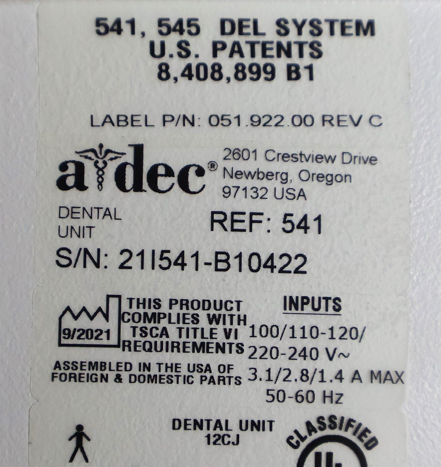 - Exam Chair Serial Number: 311= 21I311-B14661 // 422= 21I422-A13871 // 541-545= 21I541-B10945