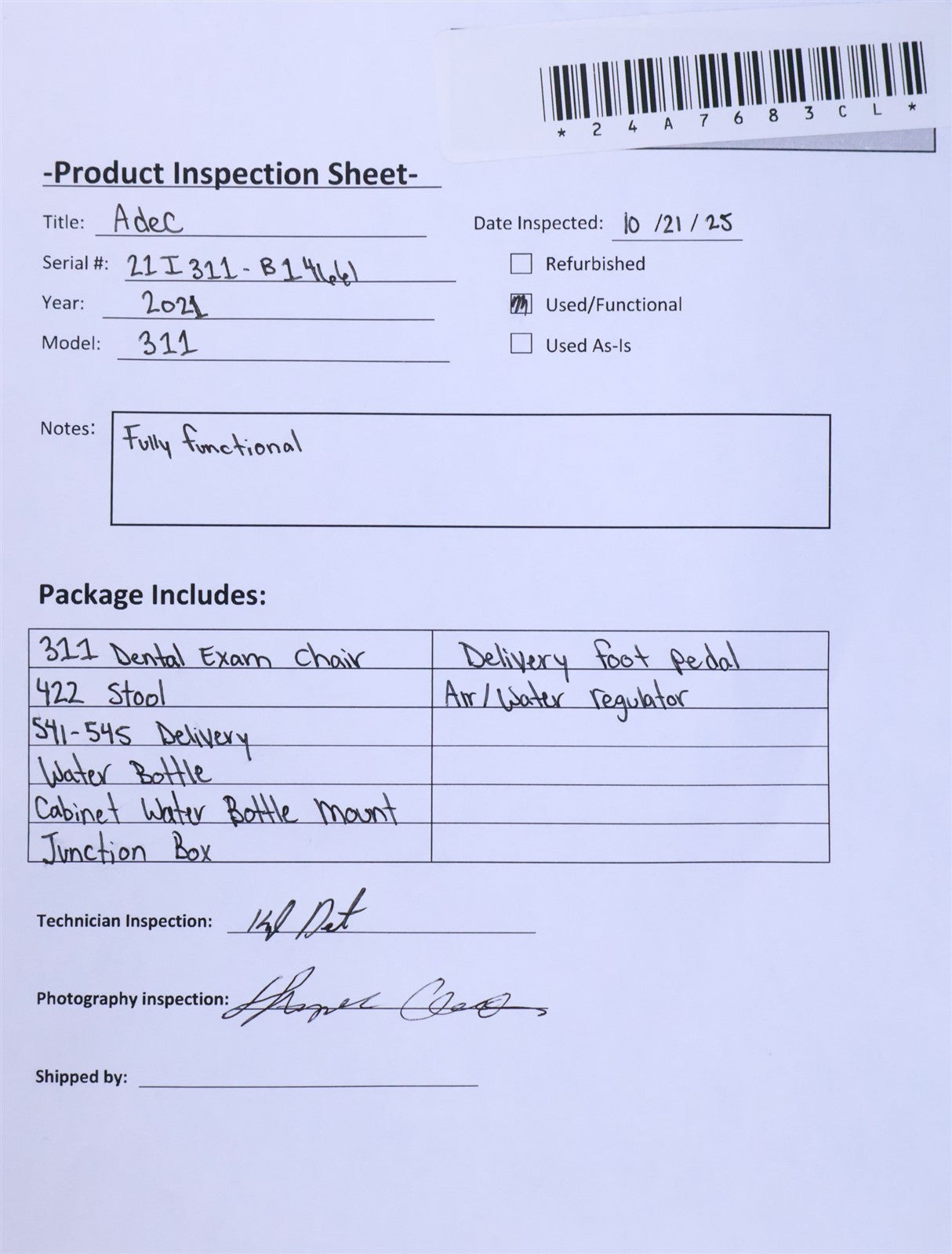 Prior to function testing the Adec 311 Dental Chair, visually inspected all components included in package. The 422 Dr Stool is in GREAT condition. Casters move freely and upholstery is damage free. The 541/545 Adec Delivery system (both Dr and Assistant) is disassembled and will REQUIRE NEW HOSES. Dr delivery includes x3 -3- hole connections and x1 - 6hole. Assistant delivery will require new particle net and proper set up prior to use. Proceeded to attach Adec 311 to requried 120v power source, raising, lowering and adjusting incline to ensure hydraulics are functioning. Arm rest move and lock as intended. FULLY FUNCTIONAL.