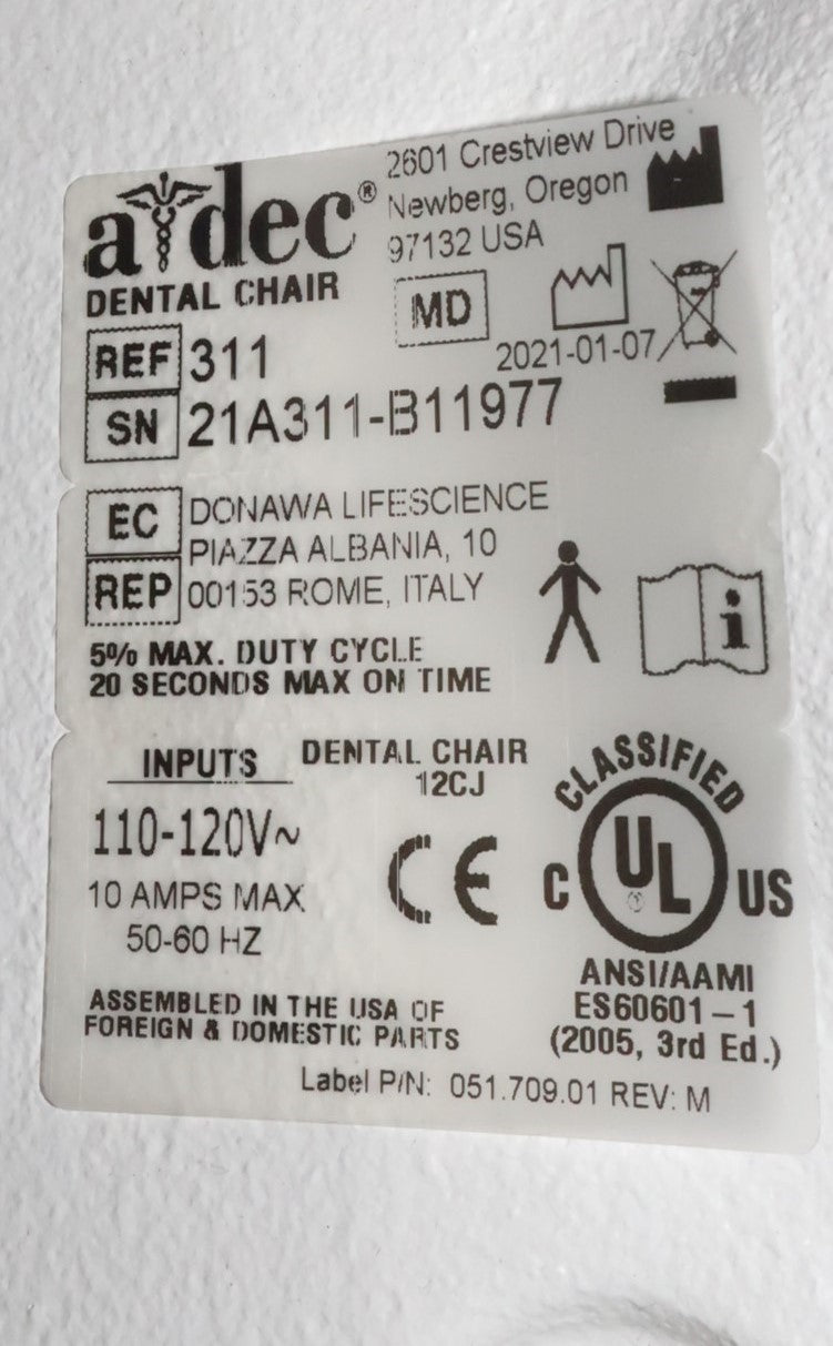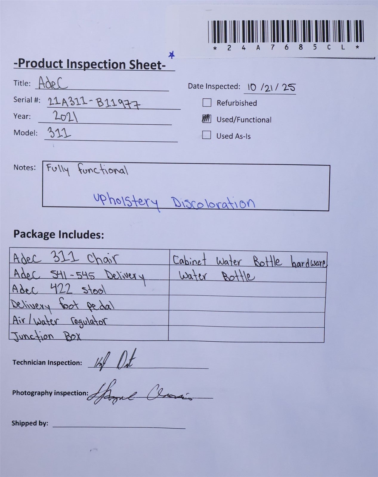 Your purchase will NOT include: This product is pre-owned and may not include the same accessories as a new, unused unit. - other accessories not shown or listed here.Prior to function testing the Adec 311 Dental Chair, visually inspected all components included in package. The 422 Dr Stool is in GREAT condition. Casters move freely and upholstery is damage free. The 541/545 Adec Delivery system (both Dr and Assistant) is disassembled and will REQUIRE NEW HOSES. Dr delivery includes x3 -3- hole connections and x1 - 6hole. Assistant delivery will require new particle net and proper set up prior to use. Proceeded to attach Adec 311 to requried 120v power source, raising, lowering and adjusting incline to ensure hydraulics are functioning. Arm rest move and lock as intended. FULLY FUNCTIONAL.