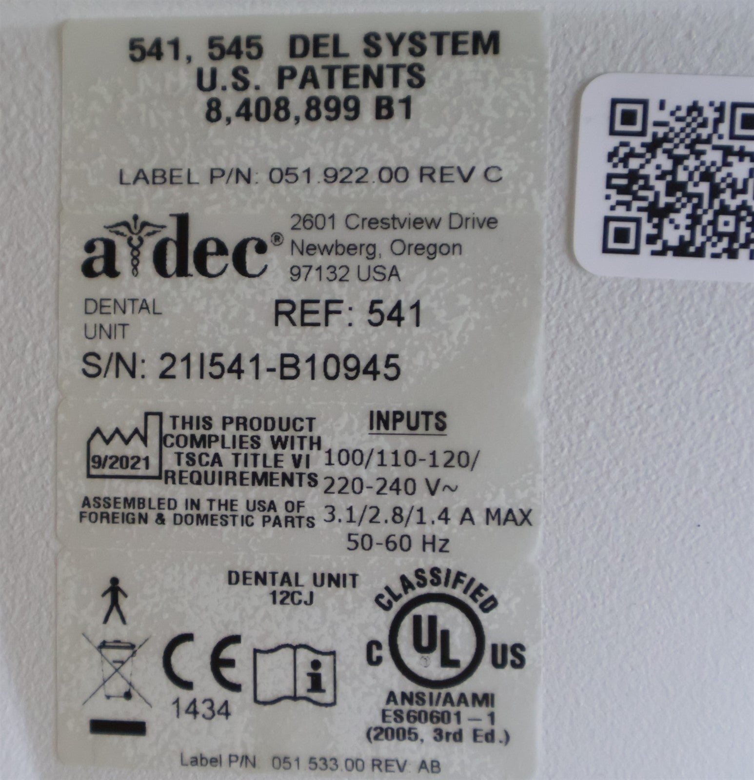 Prior to function testing the Adec 311 Dental Chair, visually inspected all components included in package. The 422 Dr Stool is in GREAT condition. Casters move freely and upholstery is damage free. The 541/545 Adec Delivery system (both Dr and Assistant) is disassembled and will REQUIRE NEW HOSES. Dr delivery includes x3 -3- hole connections and x1 - 6hole. Assistant delivery will require new particle net and proper set up prior to use. Proceeded to attach Adec 311 to requried 120v power source, raising, lowering and adjusting incline to ensure hydraulics are functioning. Arm rest move and lock as intended. FULLY FUNCTIONAL.