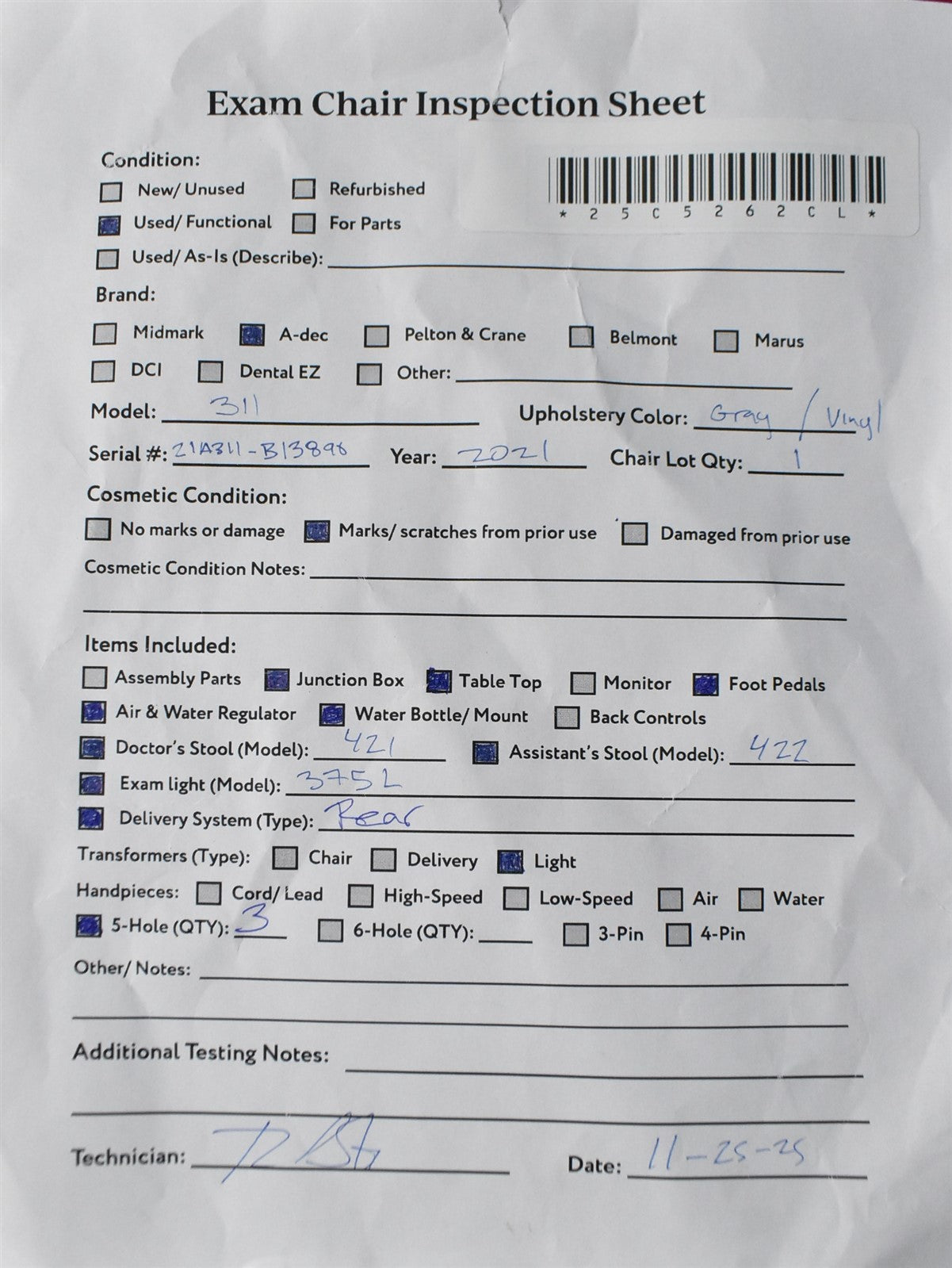 - Exam Chair Model: 311 (Gray) with 541 12 O'Clock Rear Delivery, 375L Exam Light