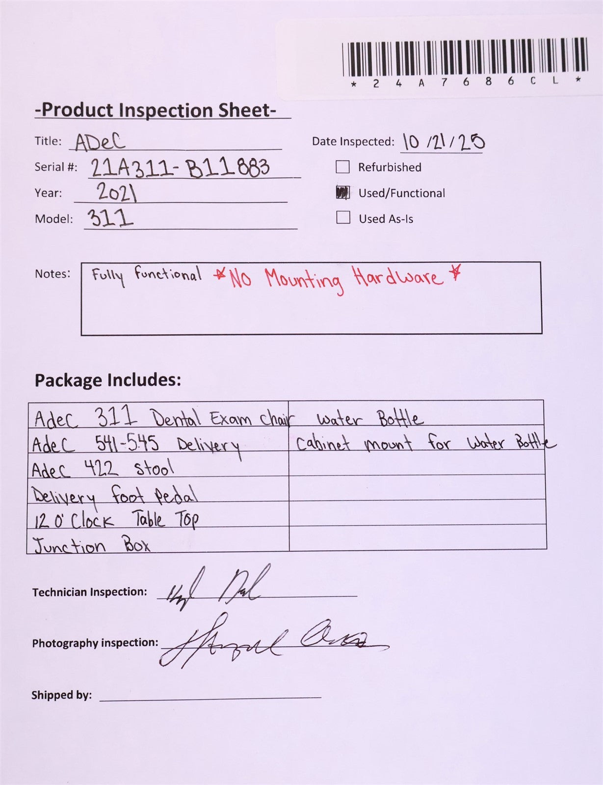 Prior to function testing the Adec 311 Dental Chair, visually inspected all components included in package. The 422 Dr Stool is in GREAT condition. Casters move freely and upholstery is damage free. The 541/545 Adec Delivery system (both Dr and Assistant) is disassembled and will REQUIRE NEW HOSES. Dr delivery includes x3 -3- hole connections and x1 - 6hole. Assistant delivery will require new particle net and proper set up prior to use. Proceeded to attach Adec 311 to requried 120v power source, raising, lowering and adjusting incline to ensure hydraulics are functioning. Arm rest move and lock as intended. FULLY FUNCTIONAL