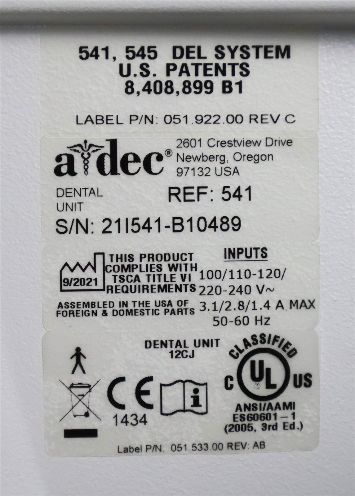 - Exam Chair Serial Number: 311= 21A311-B11977 // 422=21I422-A13872 // 541=