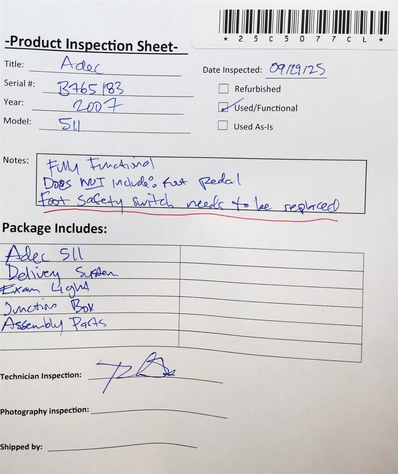 Your purchase will NOT include:This product is pre-owned and may not include the same accessories as a new, unused unit. - other accessories not shown or listed here.The exam chair has been powered on, successfully passed all functional tests, and is currently in operational condition. The exam light appears to be in good physical condition but requires a transformer to power on. Foot safety switch will need to be replaced.