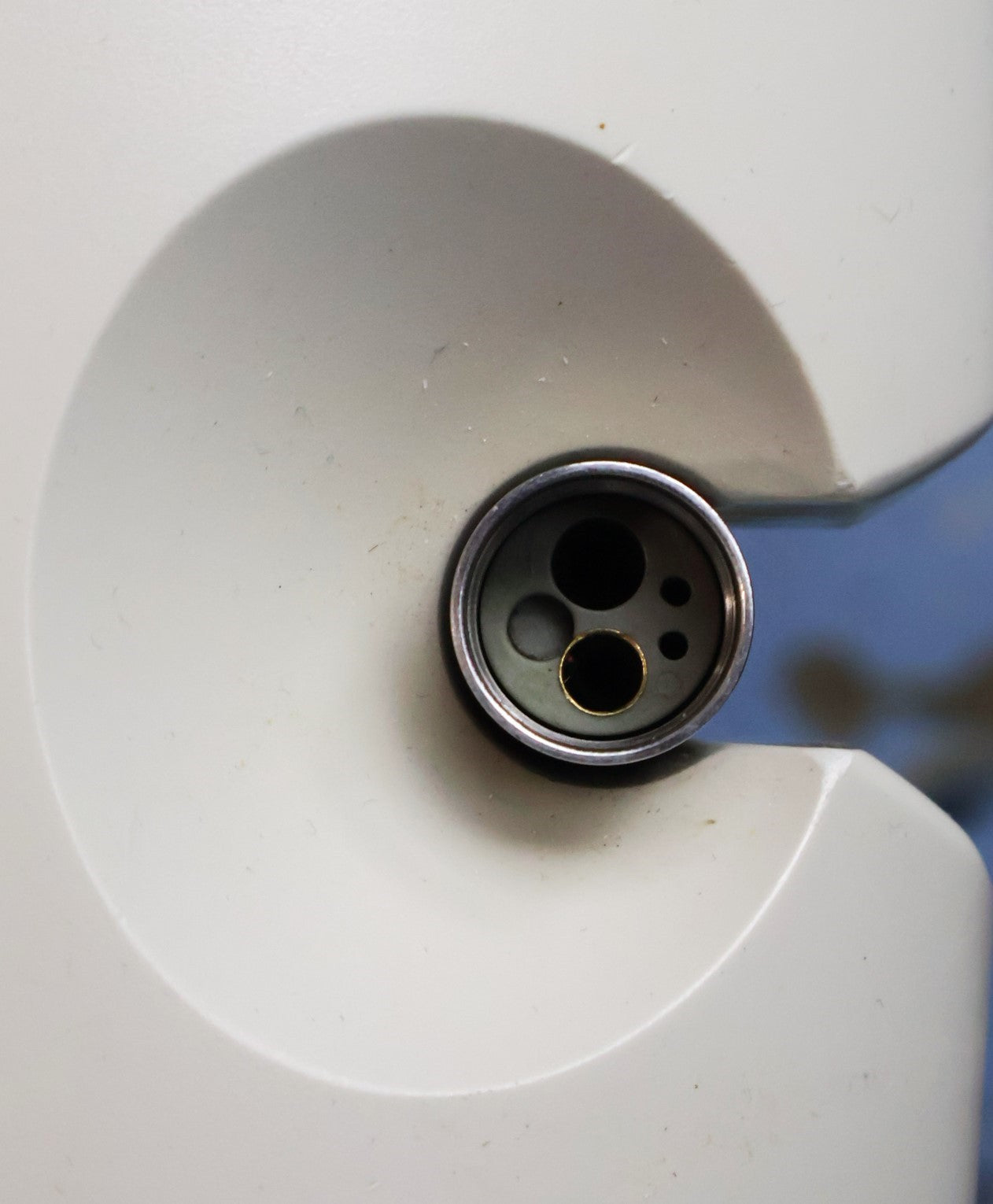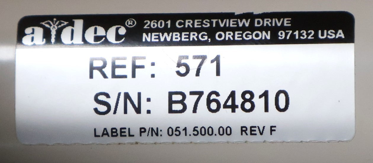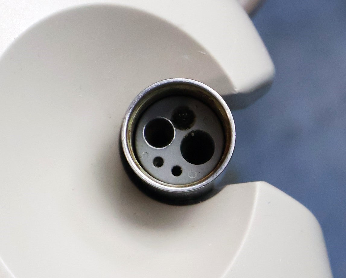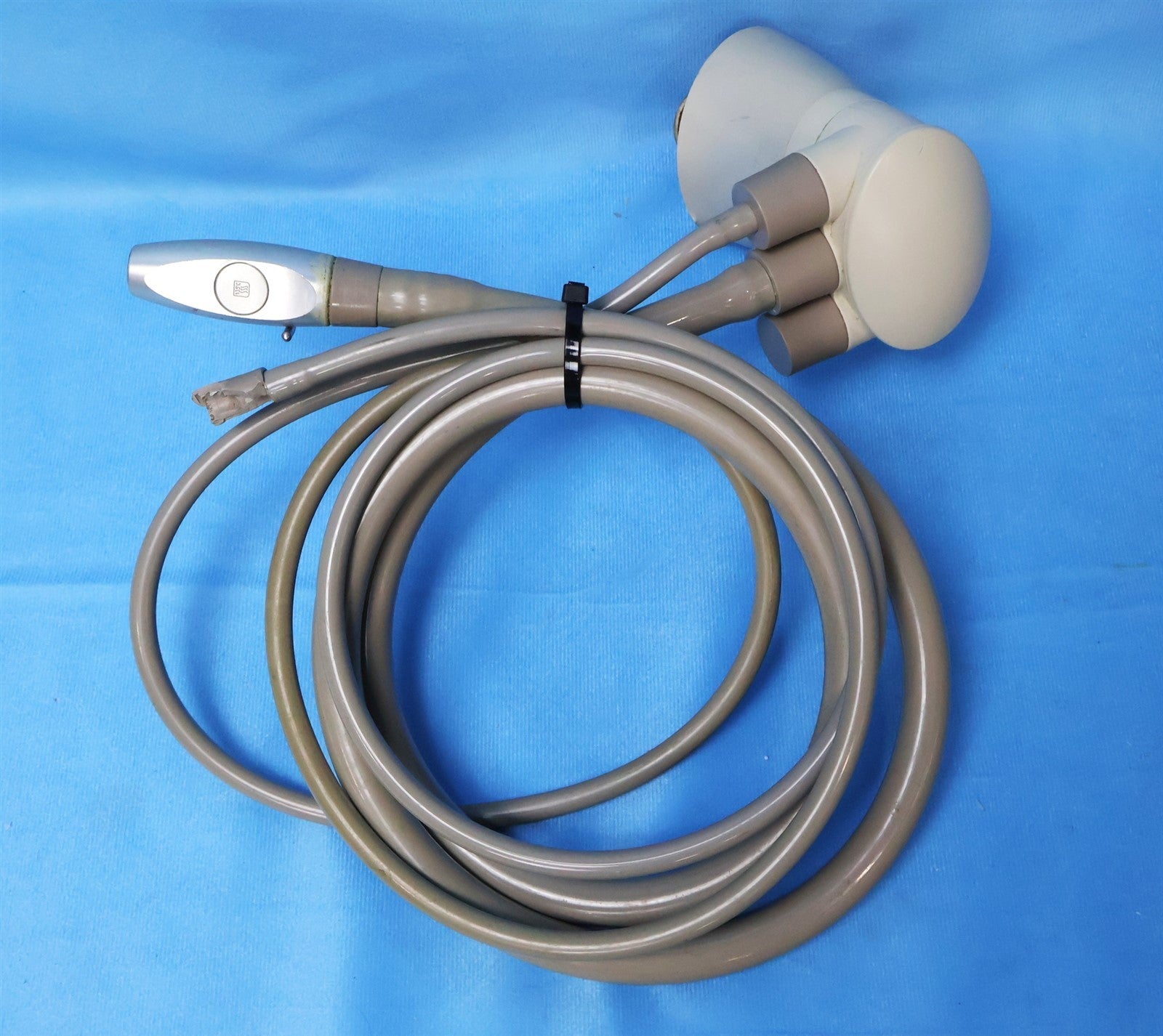 The exam chair has been powered on, successfully passed all functional tests, and is currently in operational condition. The exam light appears to be in good physical condition but requires a transformer to power on. There is noted damage to the rear delivery hose.