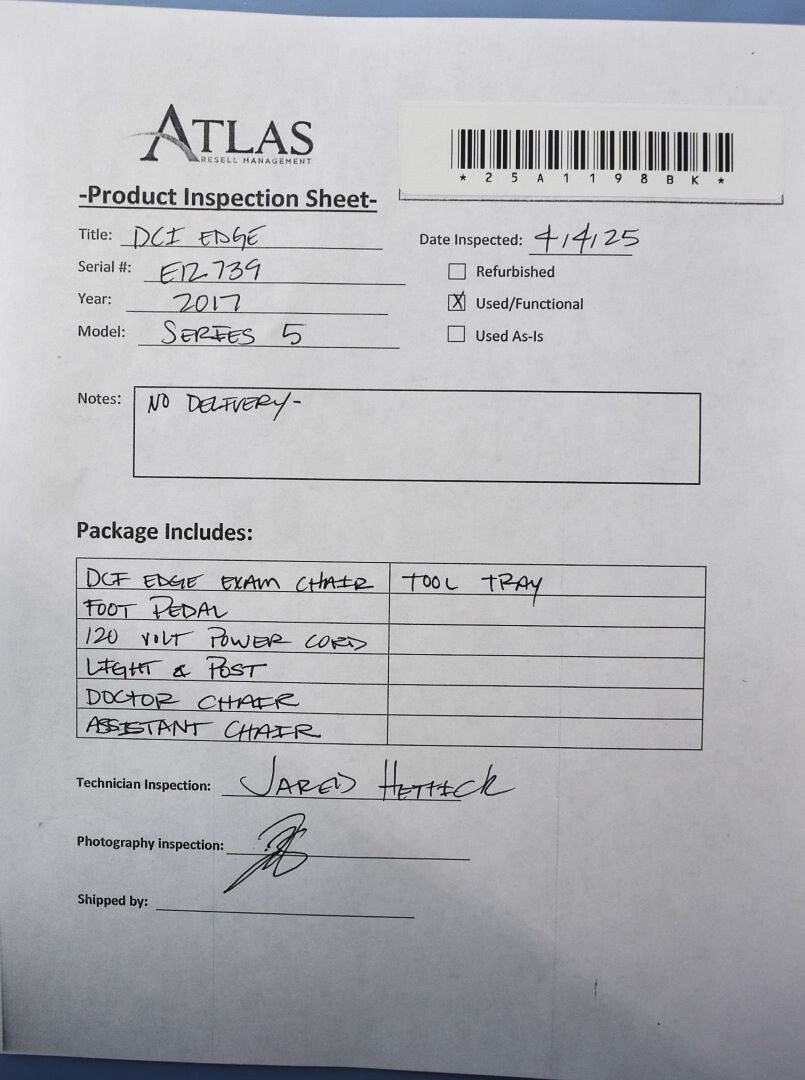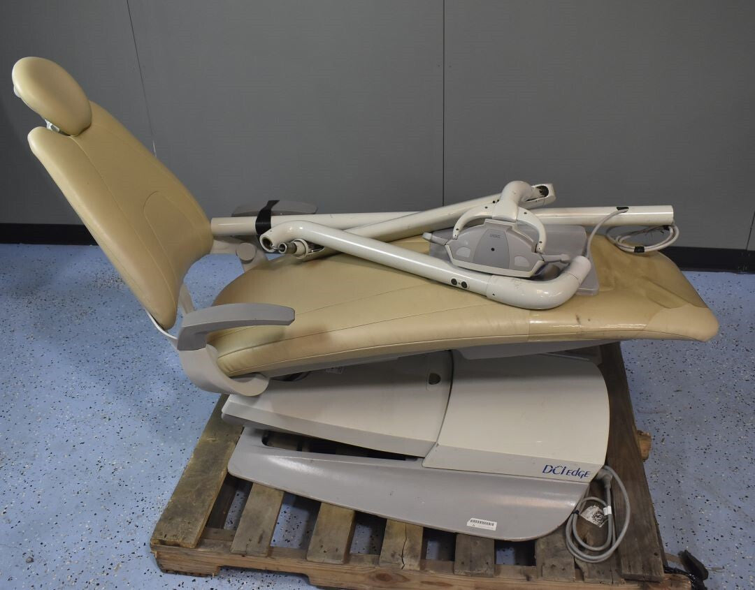 The DCI EDGE Series 5 Dental chair was inspected for structural integrity, functionality, and upholstery condition. The frame is sturdy with no visible cracks or damage. The chair's hydraulic system operates smoothly, ajusting positions without delays or unusual noise. Upholstery is intact, free of tears or evcessive wear. Armrests, footrest, and are secure and adjustable. All eletronic controls, including the preset positions and safety switches, function properly. The unit has been cleaned and disinfected. Inspection Resuly: - Ready for Resale.