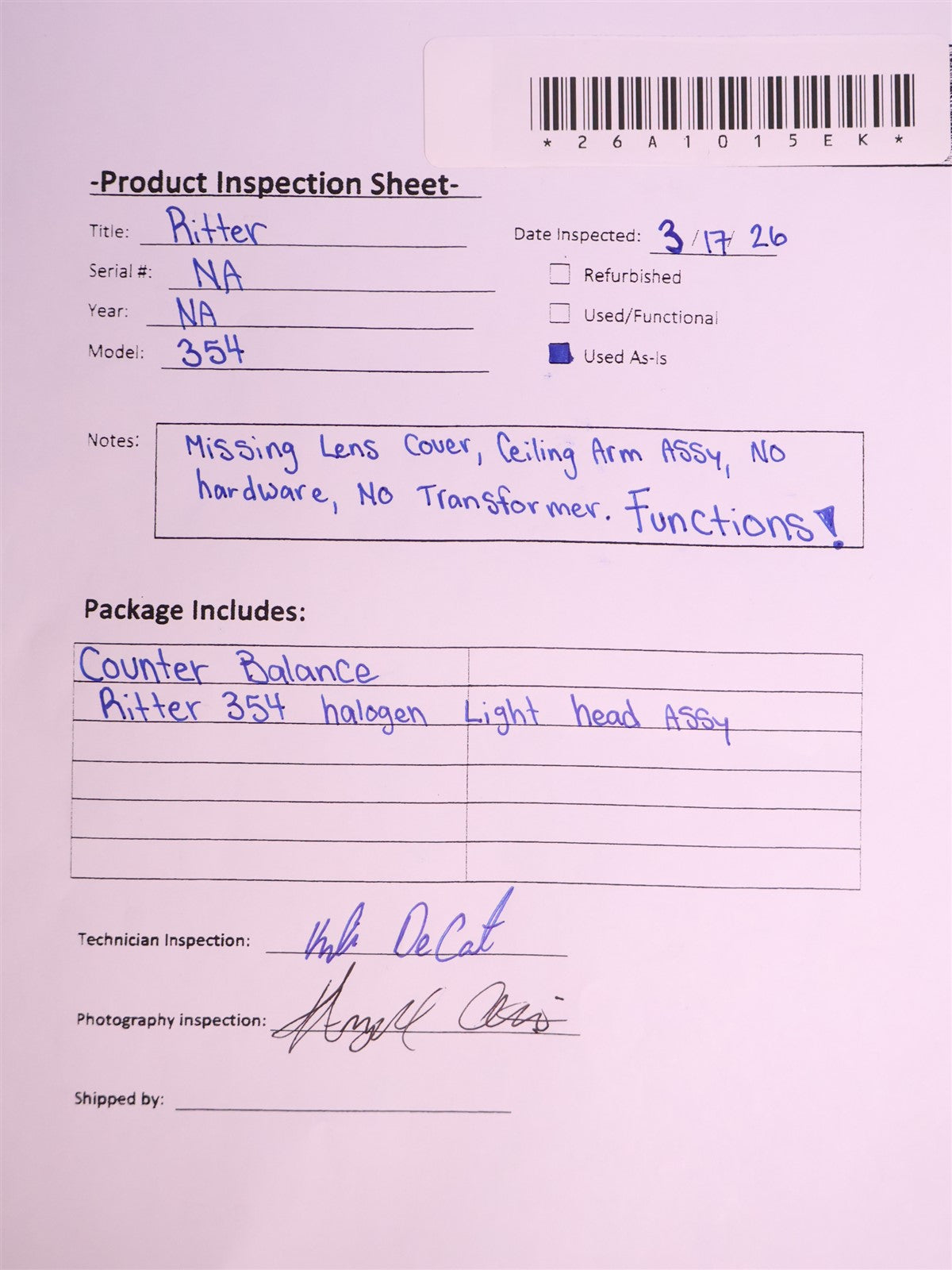 Your purchase will NOT include: - other accessories not shown or listed here.The Ritter 354 Procedure Light is a medical and dental examination light designed to provide bright, focused illumination during clinical examinations and minor surgical procedures. Its primary purpose is to deliver a crisp, adjustable light pattern that allows clinicians to clearly view tissue, teeth, and anatomical structures while performing examinations or treatments. includes features such as a built-in cooling fan, adjustable light pattern (approximately 3–10 inches), and a sterilizable handle for positioning the light during procedures. Upon arrival of this Ritter 354 Procedure Light it underwent a complete product quality inspection. Visually inspected unit, NO LENS COVER, NO TRANSFORMER, NO CEILIING ARM ASSY OR HARDWARE. Proceeded to the functionality phase of inspection. Tested with a transformer from another unit. Properly hardwired to requried 120V power source, connecting pre wired harness to transformer. Illuminating a bright beam after powered on. Power switch functions. WHAT IS INCLUDED WITH ITEM COUNTERBALANCE, RITTER 354 WITH NO LENS COVER OR TRANSFORMER. This unit functions, but is NOT COMPLETE. FINAL PRODUCT INSPECTION STATUS- INCOMPLETE.