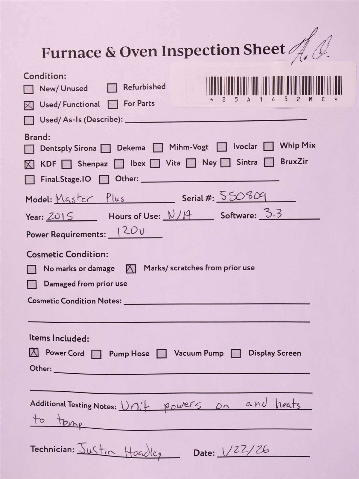 Your purchase will NOT include: Vacuum PumpThis product is pre-owned and may not include the same accessories as a new, unused unit. - other accessories not shown or listed here.The unit was powered on and subjected to a thorough visual and functional inspection. The display is clear, with no evidence of cracks, dead pixels, or other defects. All control buttons respond appropriately, and the door operates smoothly without resistance. The unit was subsequently run through a complete heating cycle to verify thermal performance. Based on these evaluations, the unit is fully operational.
