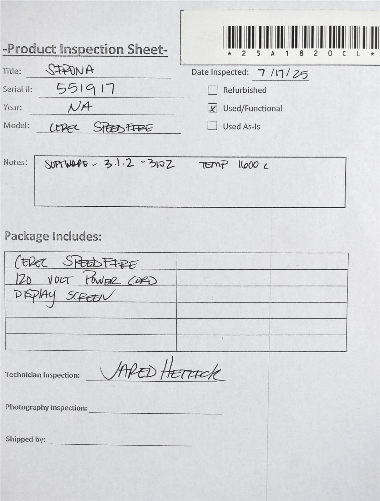 CEREC SPEEDFIRE, was inspected for physical damage, functionality, and safety. The exterior housing is intact with no visible cracks or dents. The door seal is in good condition with no sings of wear. The unit powered on successfully, and the control panel is fully functional. Ran temperature test: Pass. All controls are responsive. The unit has been cleaned and disinfected. Inspection Results: Passed- Ready for Resale