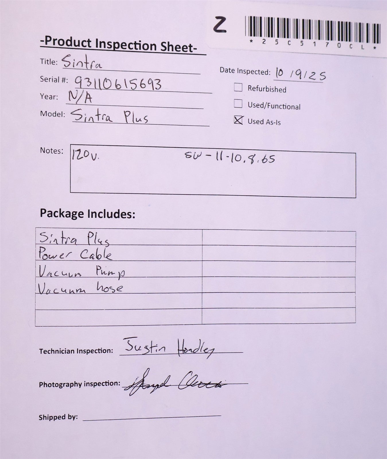 Sintra Plus, Power Cable, Vacuum Pump, Vacuum Hose
