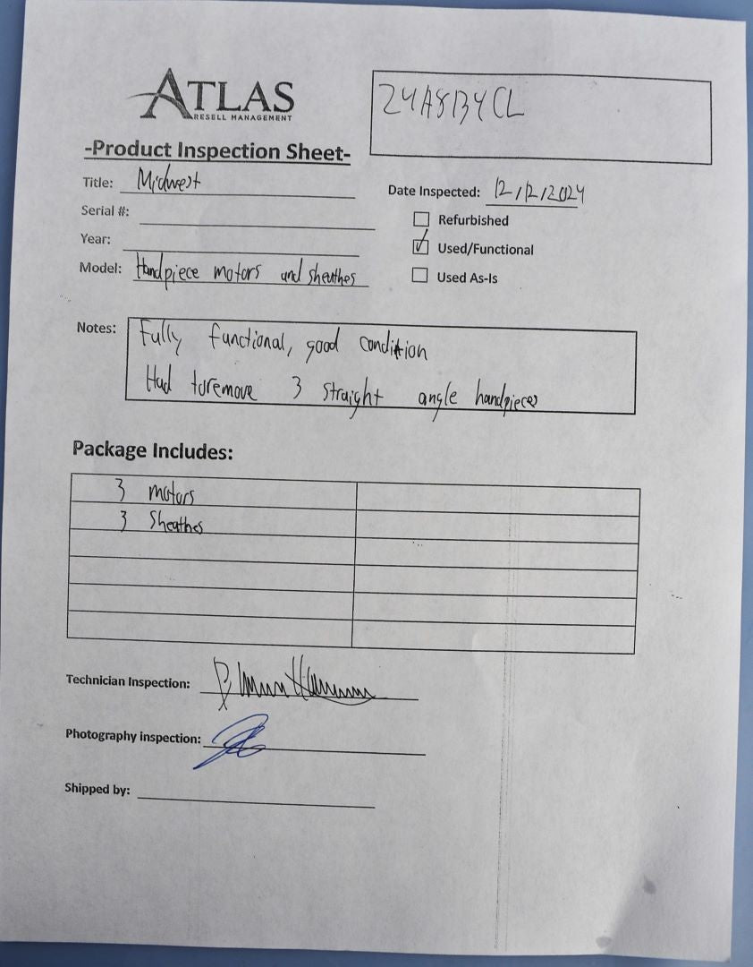 Your purchase will NOT include: 3 Straight Angle SheathesThis product is pre-owned and may not include the same accessories as a new, unused unit. - other accessories not shown or listed here.I tested each item with an air compressor. Each part was fully functional except for the three straight angle handpieces, since the entire handpiece would spin when ran, so I removed them from the unit. The contra angle sheathes and the motors were fully functional and in good condition. -BH