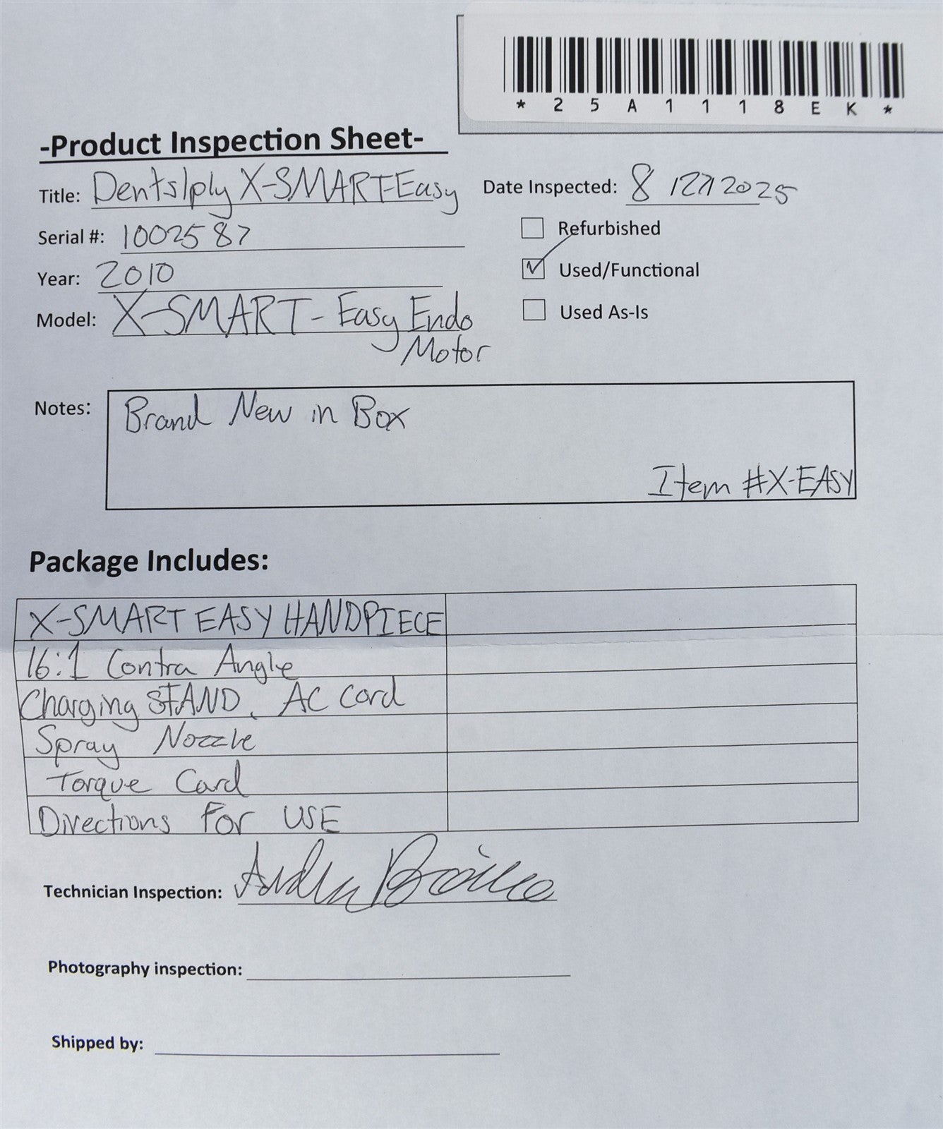 X-Smart Easy Handpiece, 16:1 Contra Angle, Charging Stand, AC Cord, Spray Nozzle, Torque Card, Directions For Use.