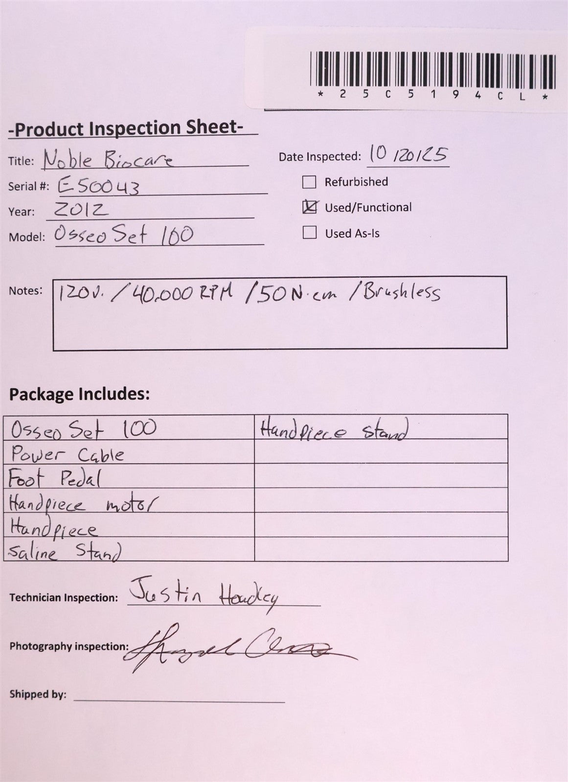 Your purchase will NOT include: This product is pre-owned and may not include the same accessories as a new, unused unit. - other accessories not shown or listed here.The unit was powered on and underwent a comprehensive inspection. The display screen was evaluated for clarity and responsiveness, while all control buttons were tested to confirm operational integrity. Both the foot pedal and handpiece were assessed for functionality. All components are performing as expected and are fully operational.