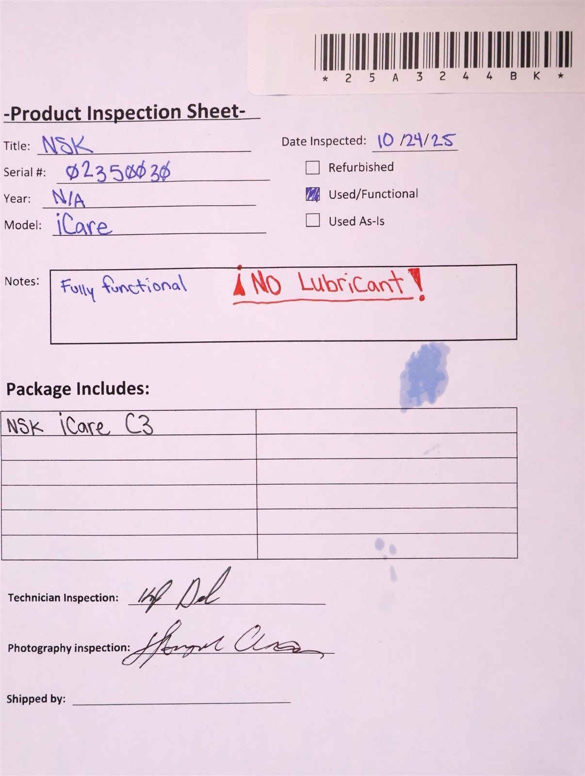 This NSK iCare C3 is a chuck lubricating machine for maintaining the handpiece longevity. All keypad functions work and respond. Burr feature also responds and functions as intended. NO LUBRICANT INCLUDED. Lubricant cap and filter and power cord included. Fully functional. FINAL INSPECTION STATUS PASSED.