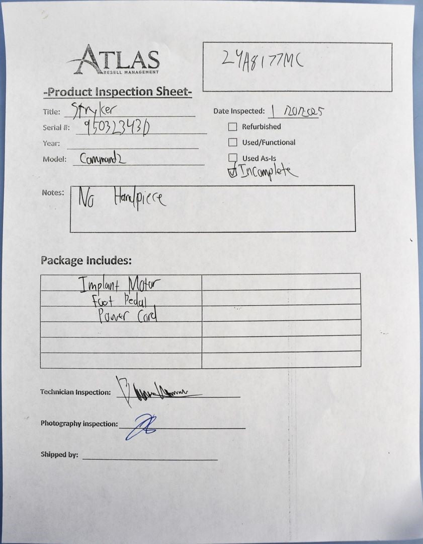 Your purchase will NOT include: manufacturer warranty, or any other accessories not shown or listed here.I didn't have the handpiece to test this or mark it as functional. The cosmetic condition is decent with small marks on much of the implant's surface. -BH
