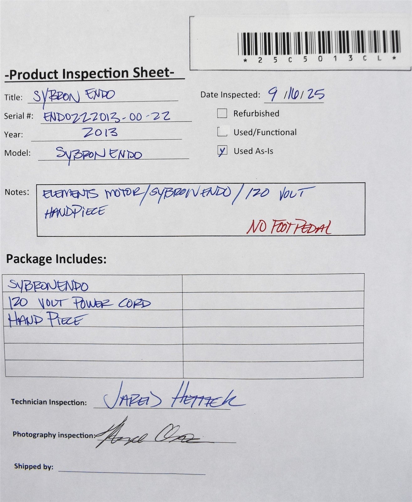 Your purchase will NOT include: FOOT PEDALThis product is pre-owned and may not include the same accessories as a new, unused unit. - other accessories not shown or listed here.SybronEndo Elements Motor - I Plug in the unit and power on. Confirm LCD screen activates with no pixel faults. I looked for the SybronEndo logo and preset menu. Attach the handpiece and contra-angle. Tested High and Low RPM.