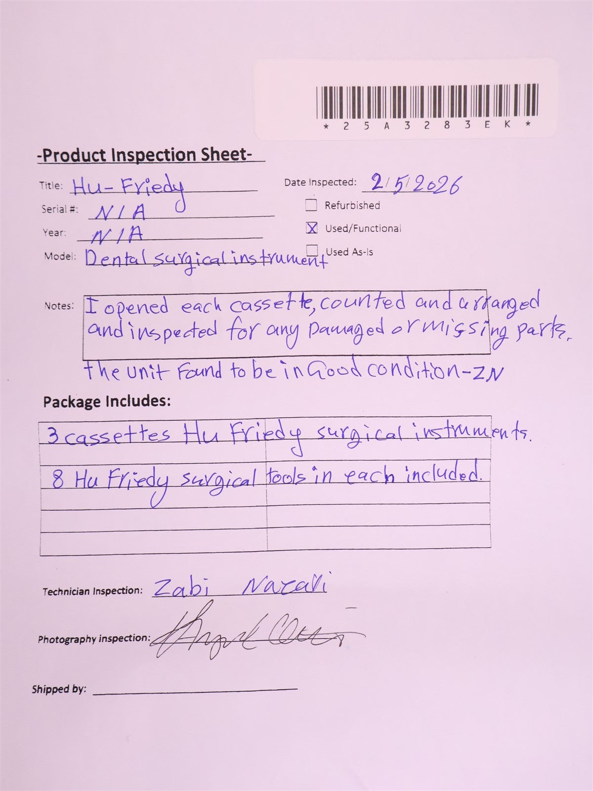 The unit was visually inspected for any damaged or missing parts, I opened each cassette counted and arranged the tools. The unit found to be in good condition-ZN