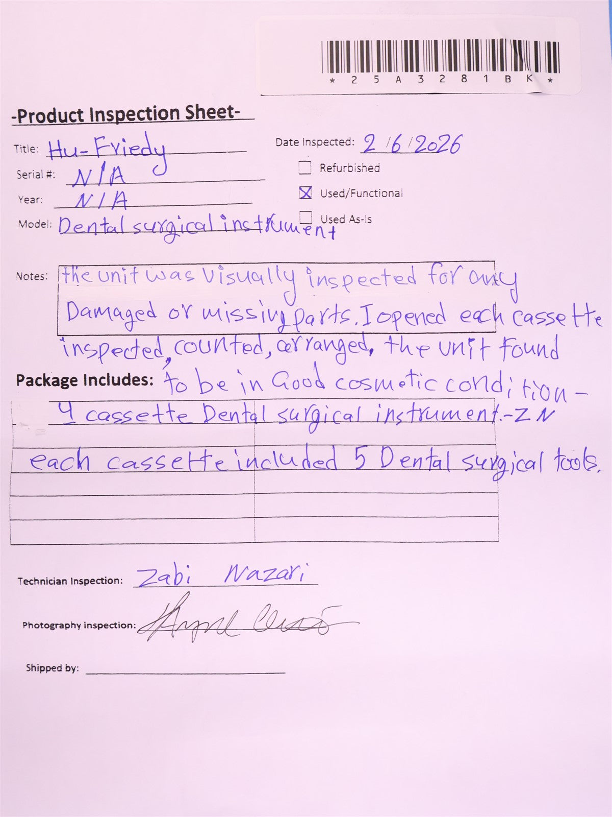 The unit was visually inspected for any damaged or missing parts. I opened each cassette inspected, counted, arranged all tools. The unit found to be in good condition-ZN