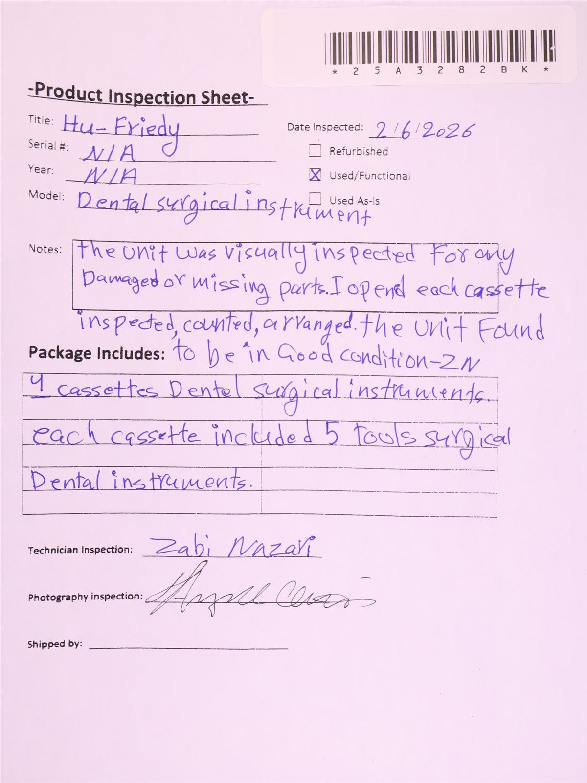 The unit was visually inspected for any damaged or missing parts. I opened each cassette inspected, counted , arranged all tools. The unit found to be in good condition-ZN