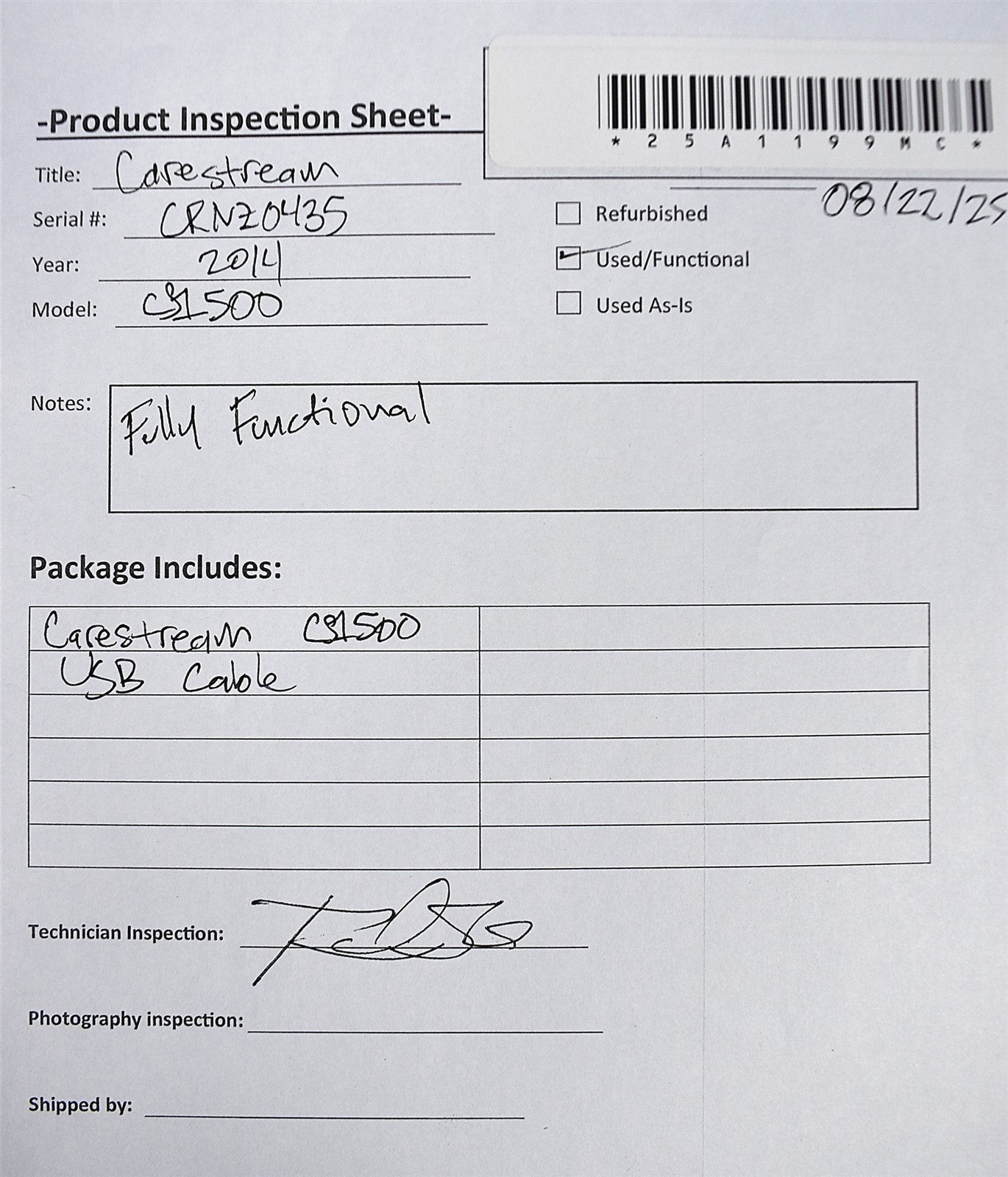 Your purchase will NOT include: This product is pre-owned and may not include the same accessories as a new, unused unit. - other accessories not shown or listed here. True Autofocus with Liquid Lens Technology: Automatically focuses like the human eye—no manual adjustments needed. Superior Image Resolution: 1024 × 768 still images, offering exceptional detail for patient education and diagnostics. Wide Focus Range: From 1 mm to infinity—captures full-arch to macro views with sharp clarity. Auto-Adjusting 8-LED Lighting: Optimizes illumination and contrast for true-to-life color in any environment. Wired or Wireless Options: Available in both configurations for flexible setup and sharing between operatories. One-Button Image Capture: Simple ergonomics—capture and save images via USB or SD card with a single button press. Lightweight & Ergonomic Design: Comfortable handpiece (around 61 g) with easy maneuverability—even in hard-to-reach areas. TWAIN Compliant: Seamlessly integrates with Carestream software and third-party dental imaging systems.Visually inspected the unit for any damages or missing parts and accessories.