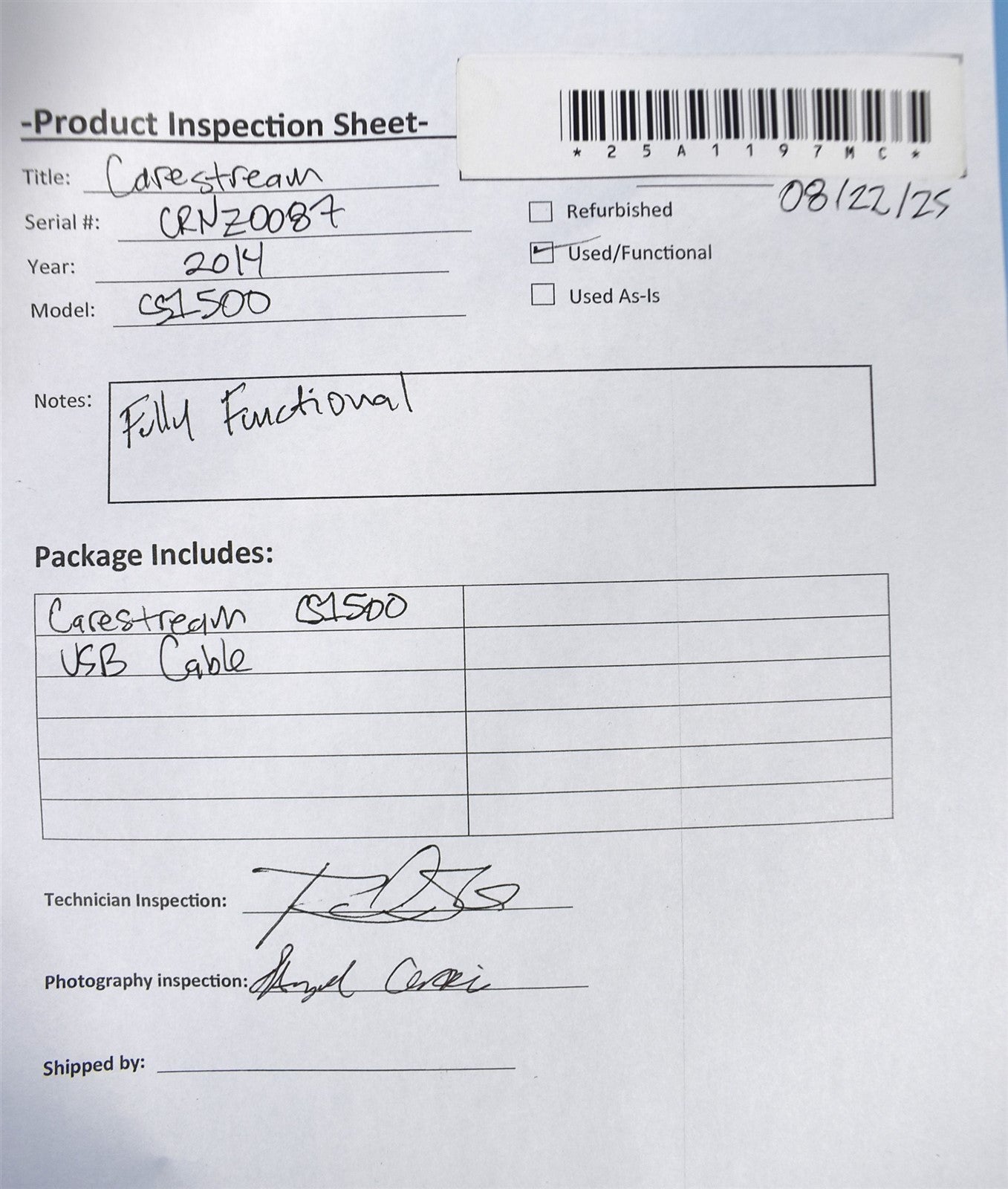 Your purchase will NOT include: This product is pre-owned and may not include the same accessories as a new, unused unit. - other accessories not shown or listed here. True Autofocus with Liquid Lens Technology: Automatically focuses like the human eye—no manual adjustments needed. Superior Image Resolution: 1024 × 768 still images, offering exceptional detail for patient education and diagnostics. Wide Focus Range: From 1 mm to infinity—captures full-arch to macro views with sharp clarity. Auto-Adjusting 8-LED Lighting: Optimizes illumination and contrast for true-to-life color in any environment. Wired or Wireless Options: Available in both configurations for flexible setup and sharing between operatories. One-Button Image Capture: Simple ergonomics—capture and save images via USB or SD card with a single button press. Lightweight & Ergonomic Design: Comfortable handpiece (around 61 g) with easy maneuverability—even in hard-to-reach areas. TWAIN Compliant: Seamlessly integrates with Carestream software and third-party dental imaging systems.Visually inspected the unit for any damages or missing parts and accessories.