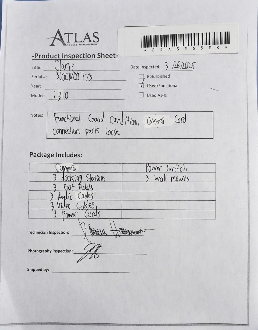 The Claris i310 was inspected for baseline functionality and overall condition. The scanner as well as each of the docking stations were able to power on and light up. The overall condition is good, with minimal cosmetic flaws and the only damage being on the scanner cord. At the end of it that connects to the docking station, the parts of the connector are loosely held together, which causes difficulty connecting the scanner. Those parts can be reset together manually, allowing the unit to be fully functional without issue as long as you are careful with it.Inspection Result: Passed - Ready for Resale