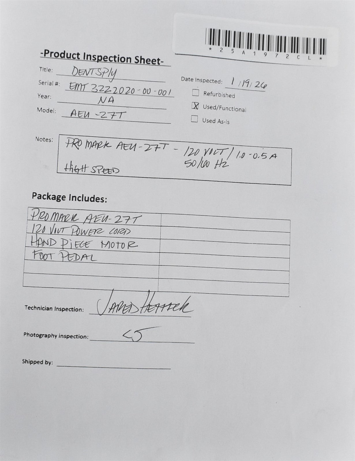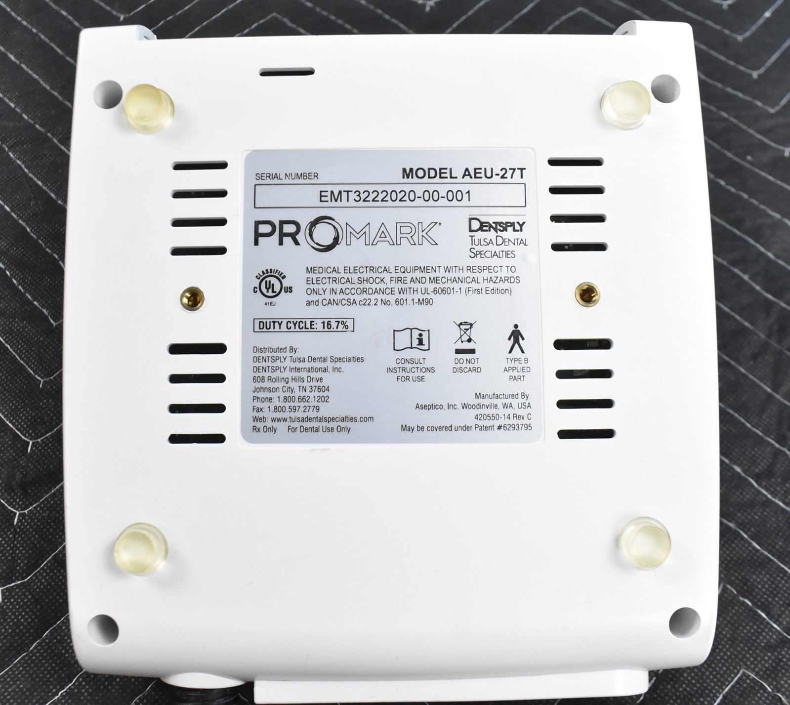 Dentsply Promark AEU-27T w/ Foot pedal- I checked over unit for damage and defects. Checked power specifications ( 120 volt). I powered on unit and connected hand piece and foot pedal, Ran handpiece ( Motor ) at full RPM's and full torque. Then ran both on lowest RPM and Torque. Fully functional. Unit has been cleaned and disinfected.