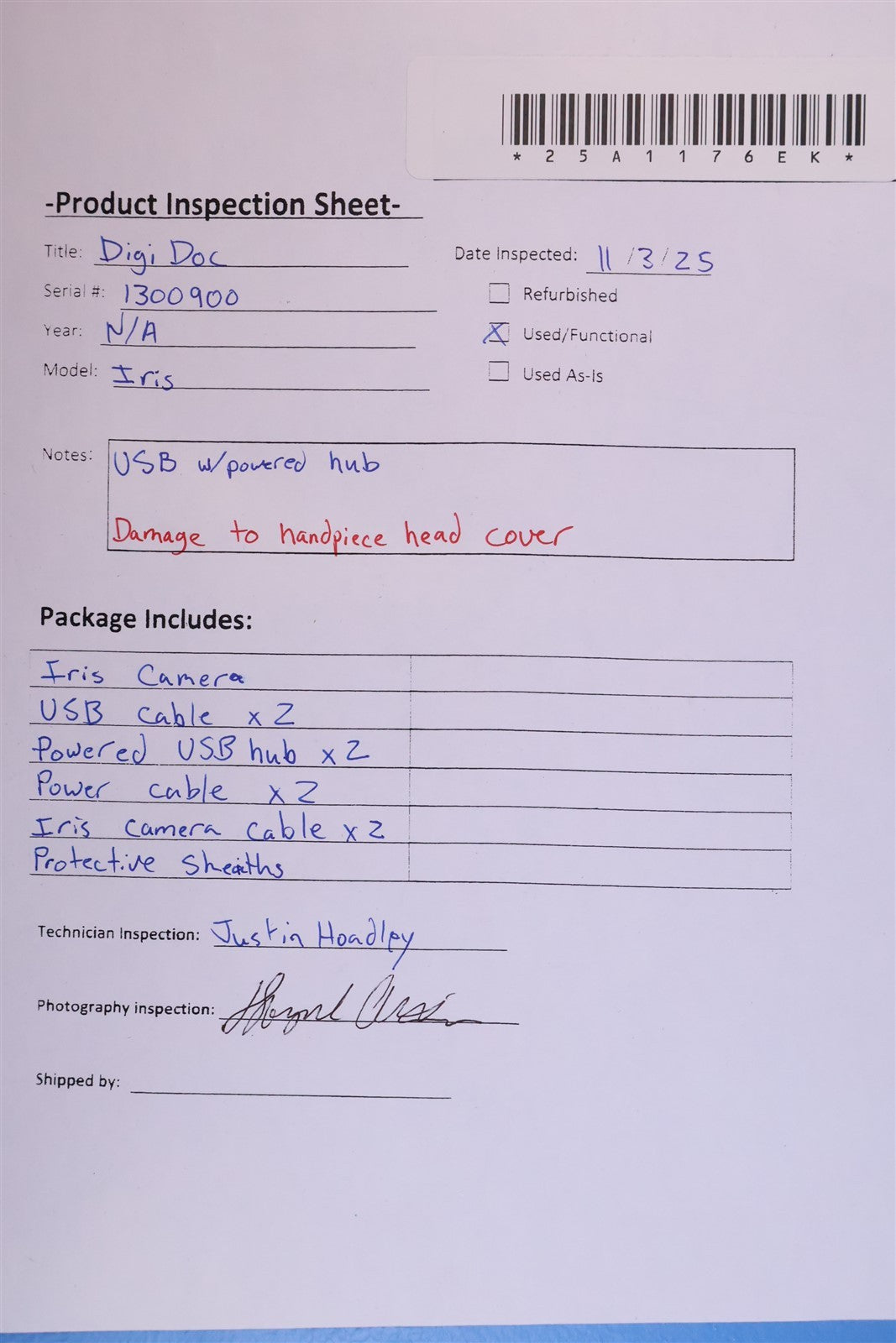 Iris Camera, 2 USB Cables, 2 Powered USB Hubs, 2 Power Cables, 2 Iris Camera USB Cables, Protective Sheaths