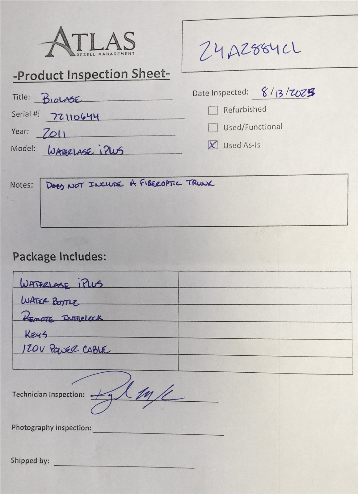 Your purchase will NOT include: Manual, Safety Glasses - other accessories not shown or listed here.Biolase Waterlase iPlus – Dental Laser SystemKey FeaturesAdvanced laser technology for precise soft and hard tissue procedures.Minimally invasive treatment for patient comfort and faster healing.User-friendly interface with customizable settings for various procedures.Durable design for reliable daily use in dental practices.Biolase Waterlase iPlus – Efficient, precise, and versatile laser dentistry.