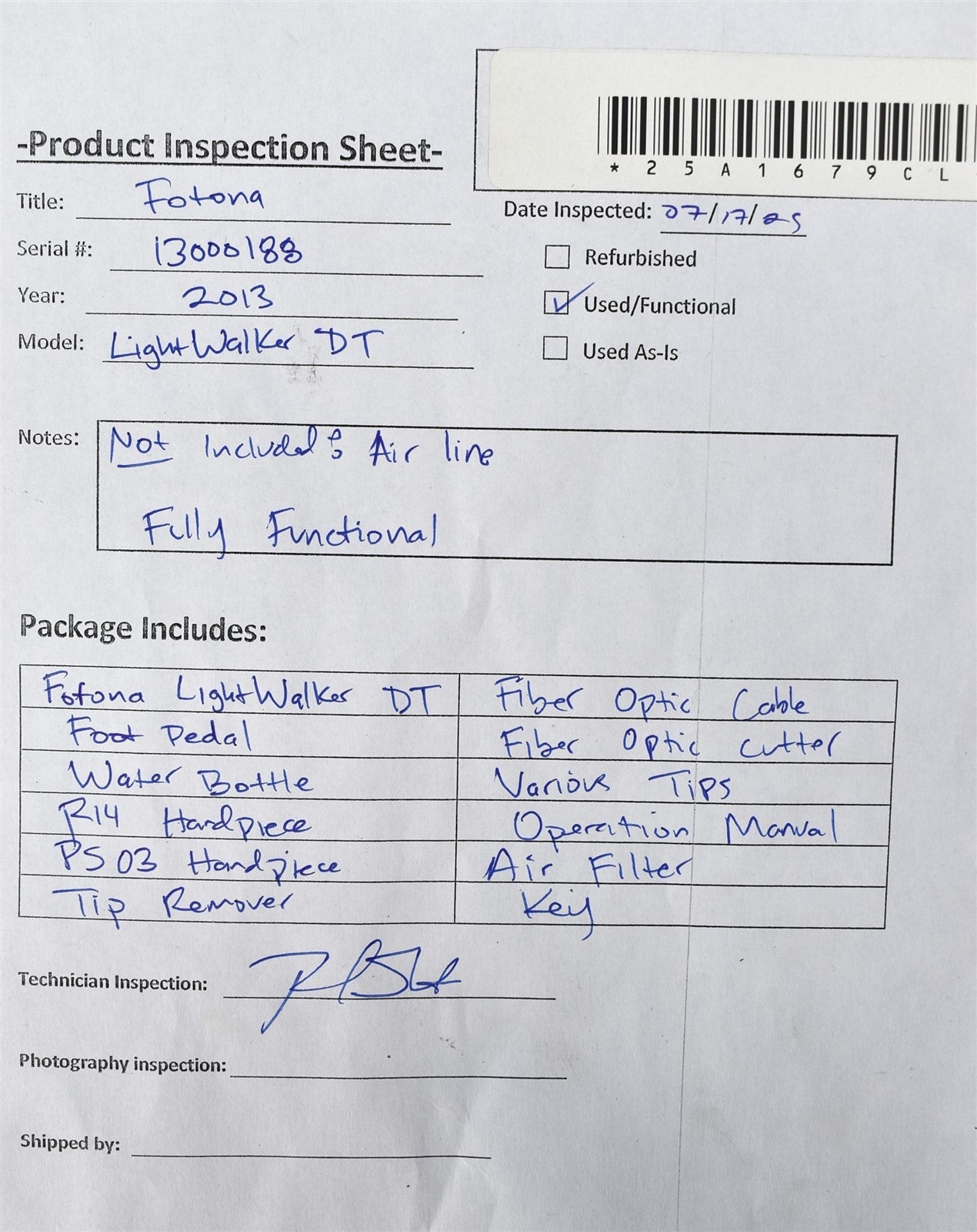 Fotona LightWalker DT, Foot Pedal, Water Bottle, R14 Handpiece, PS03 Handpiece, Tip Remover, Fiber Optic Cable, Fiber Optic Cutter, Various Tips, Operation Manual, Air Filter, Key
